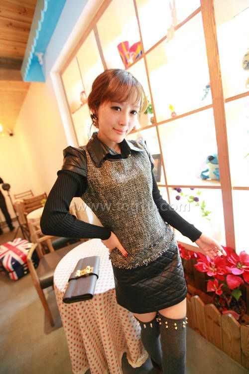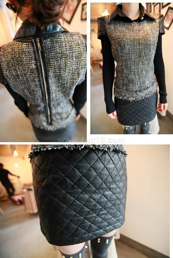 菱格皮裙拼接連衣裙 小香風 名媛混金絲拉鏈毛邊裙