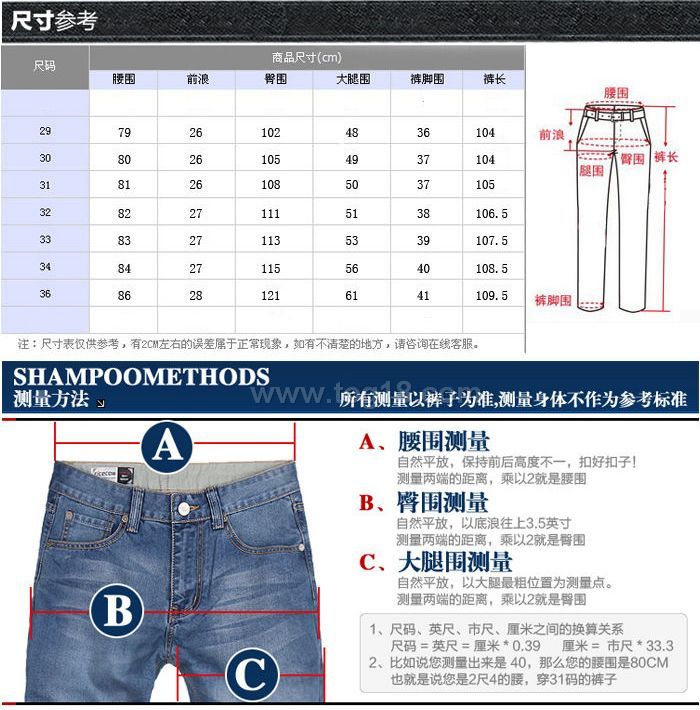 • 尺码: 28(2.16尺) 29(2.23尺) 30(2.31尺) 31(2.39尺) 32(2.46尺) 33(2.54尺)
