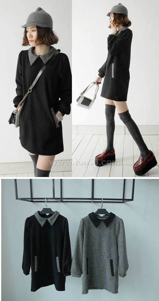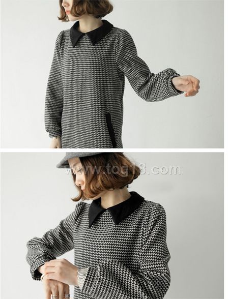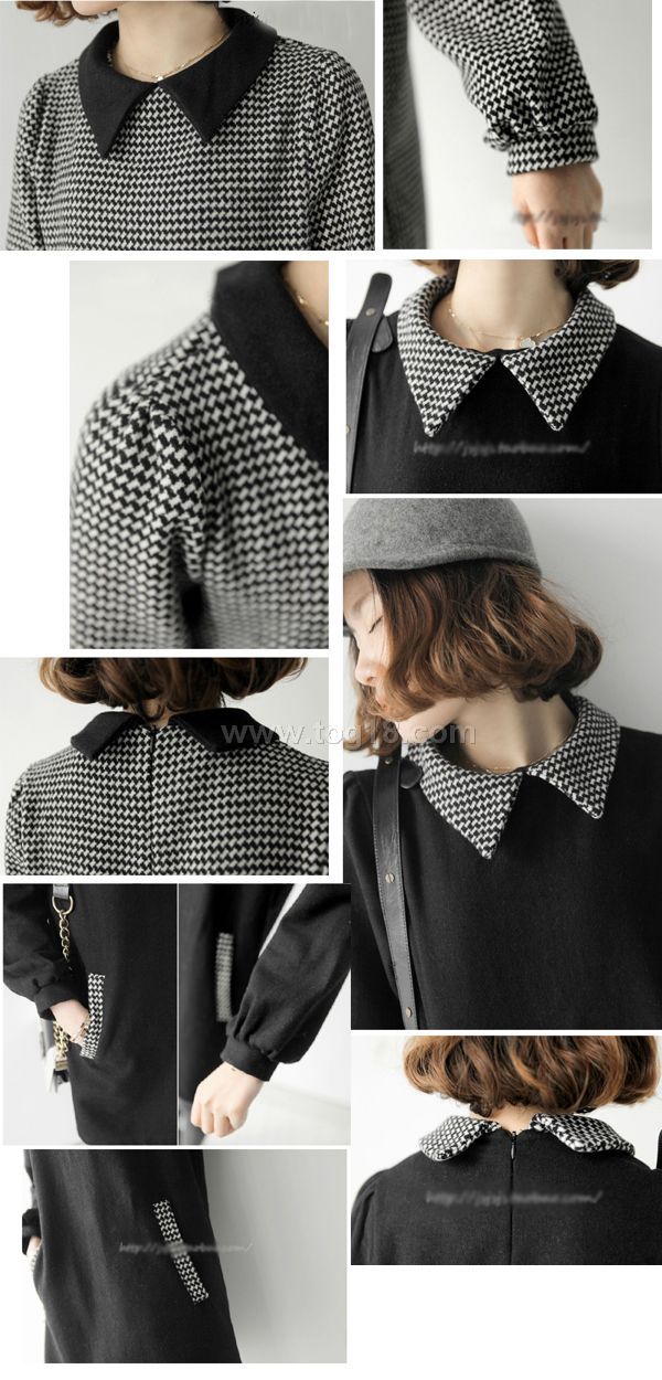 2012秋冬新款女韩版千鸟拼色格子翻领公主袖连衣裙