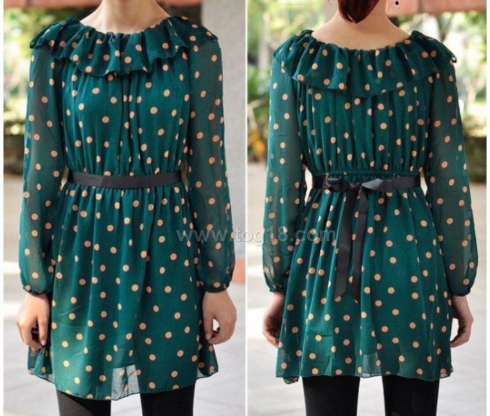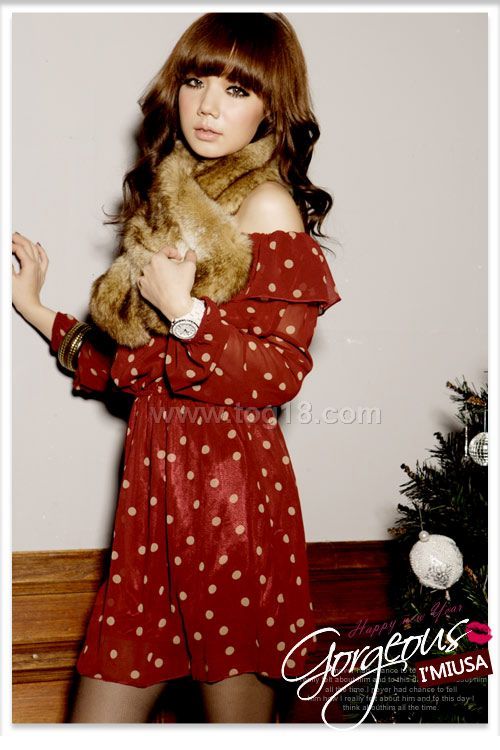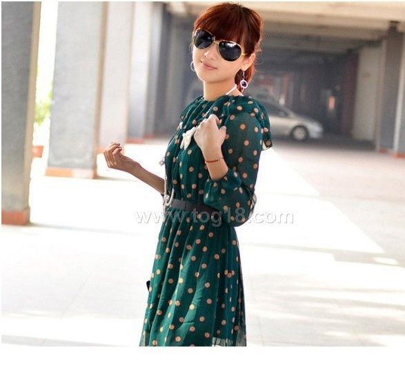 2013年新款實拍,日單,一字領,收腰,圓點雪紡連衣裙長袖