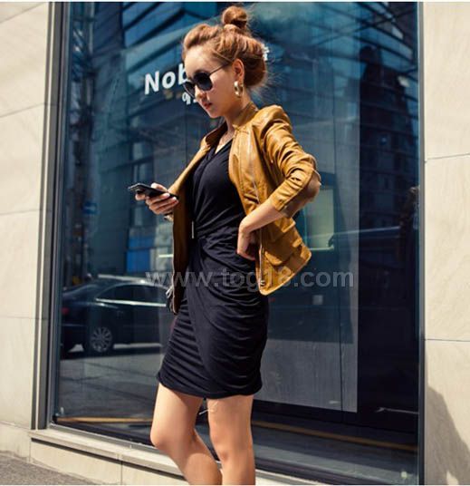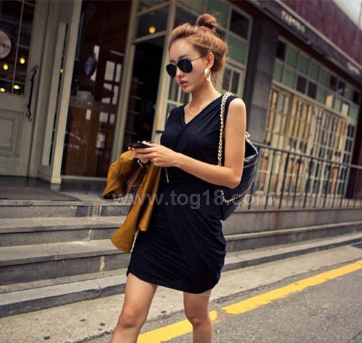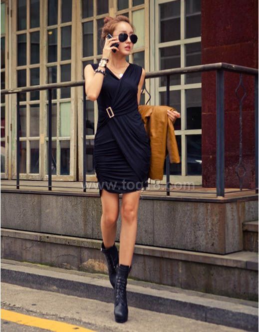 款式說明:無袖抓皺性感交叉金屬雙扣裝飾連衣裙