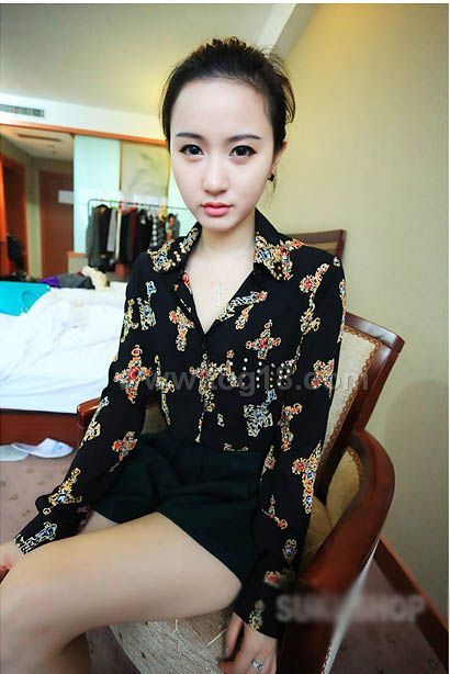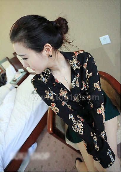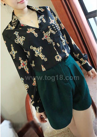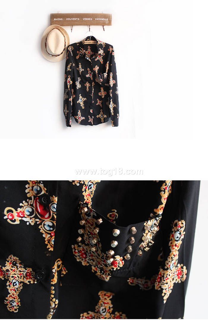 款式說明:歐美風 鉚釘裝飾復古印花雪紡襯衫 2013春季新款