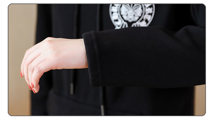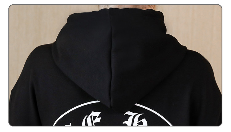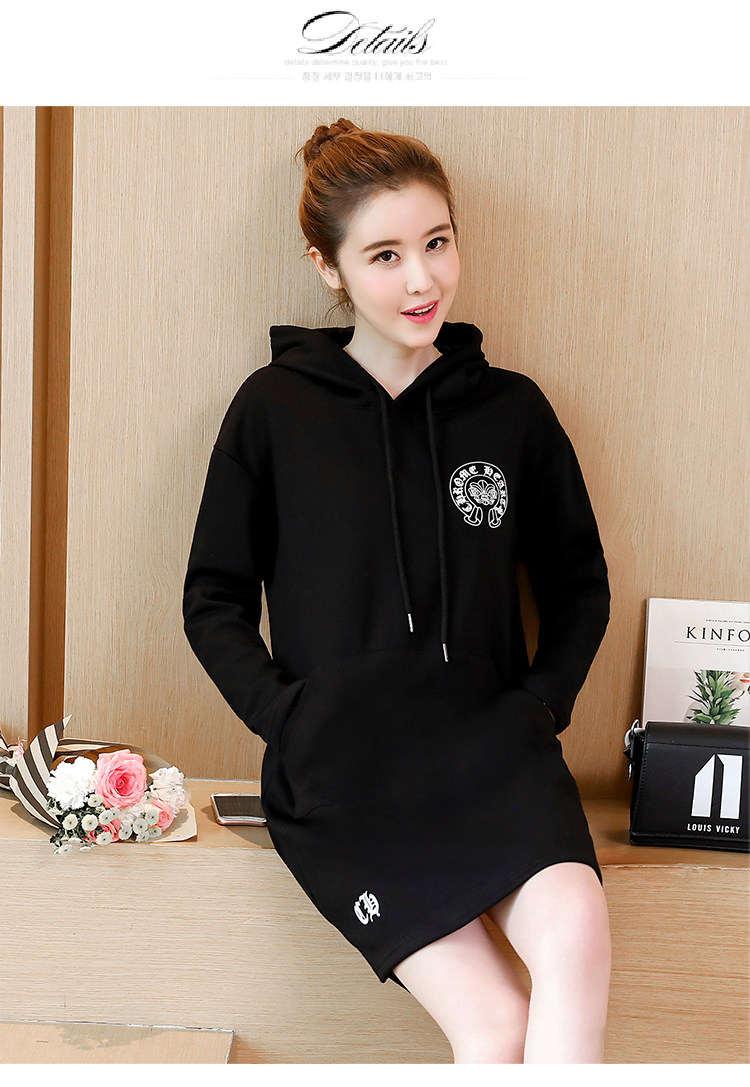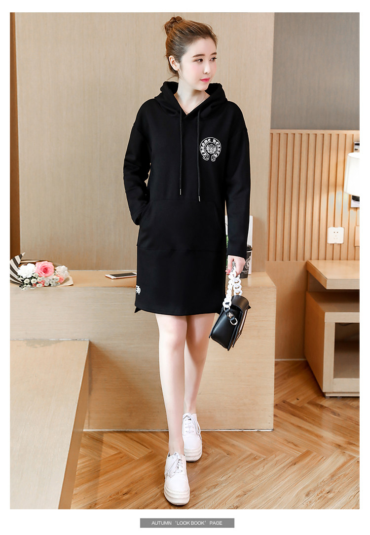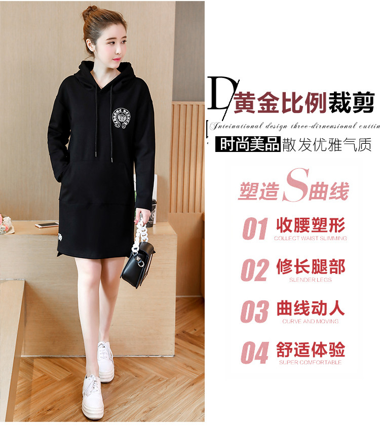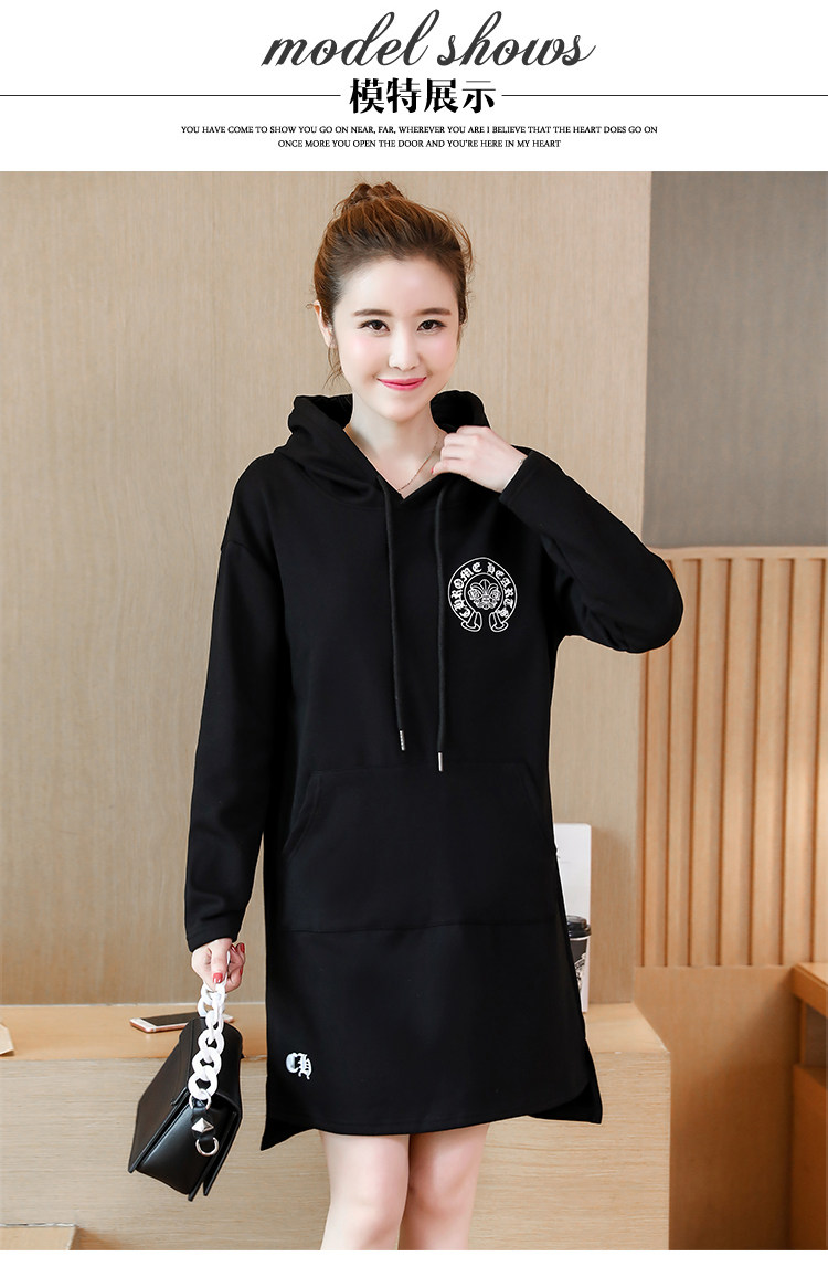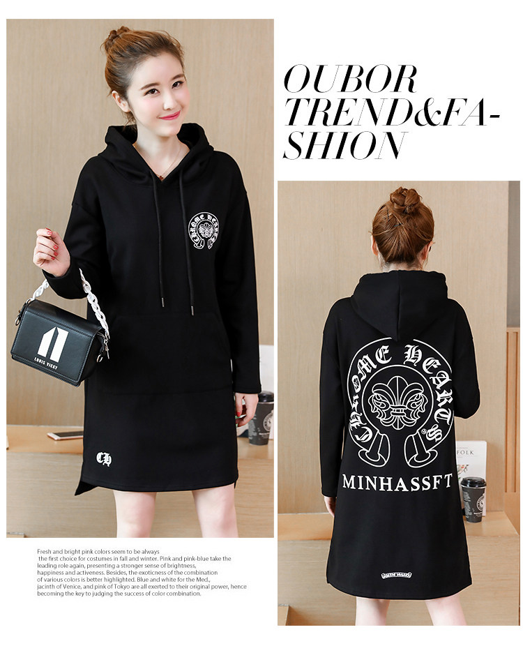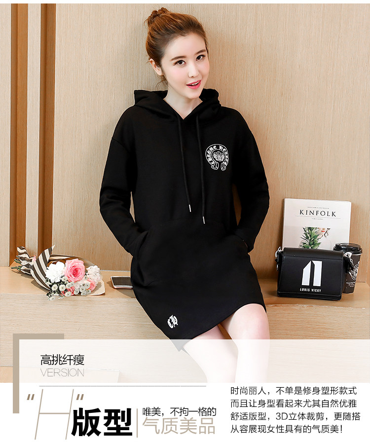 >> 大碼女裝加絨加厚2017新款冬裝胖mm黑色印花寬鬆中長款連帽衛衣