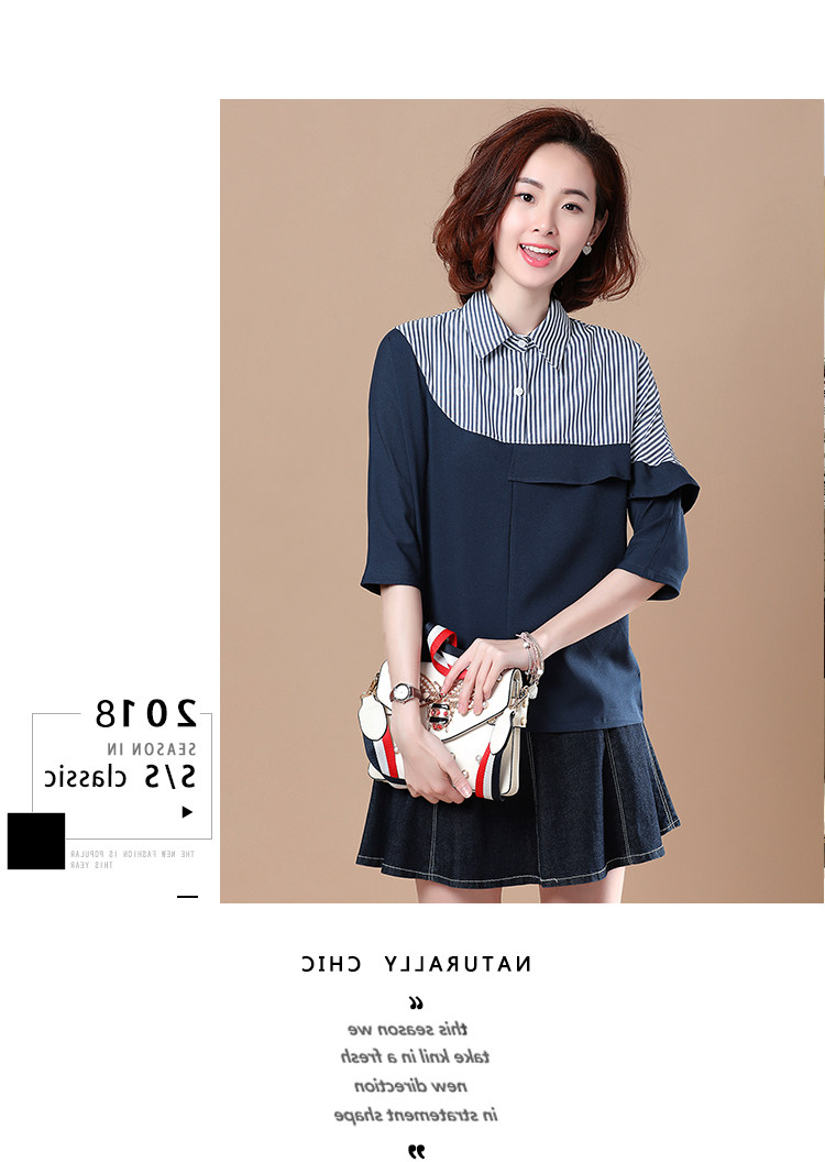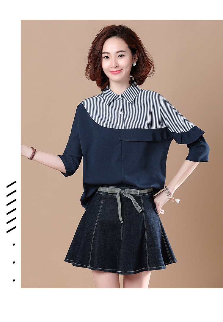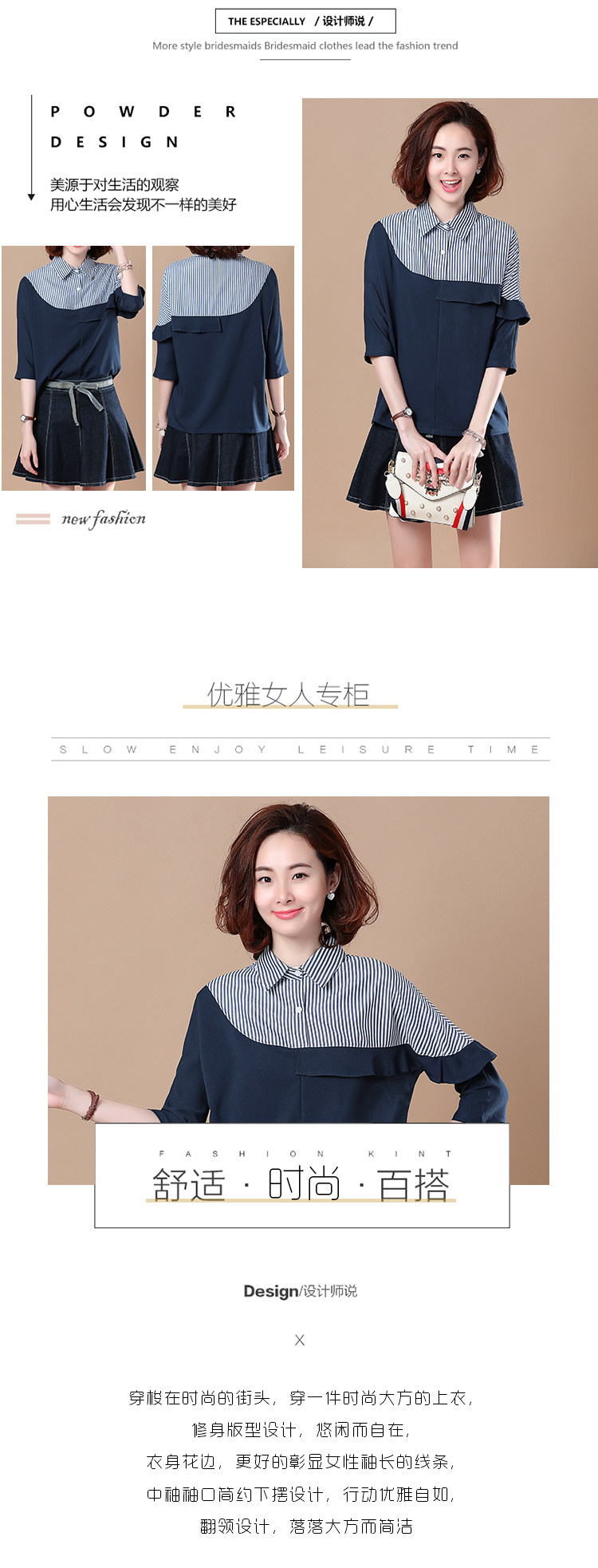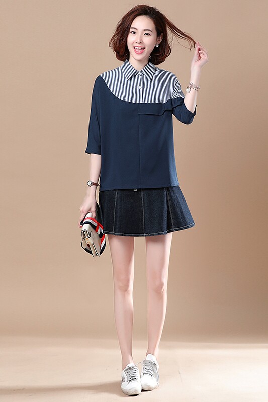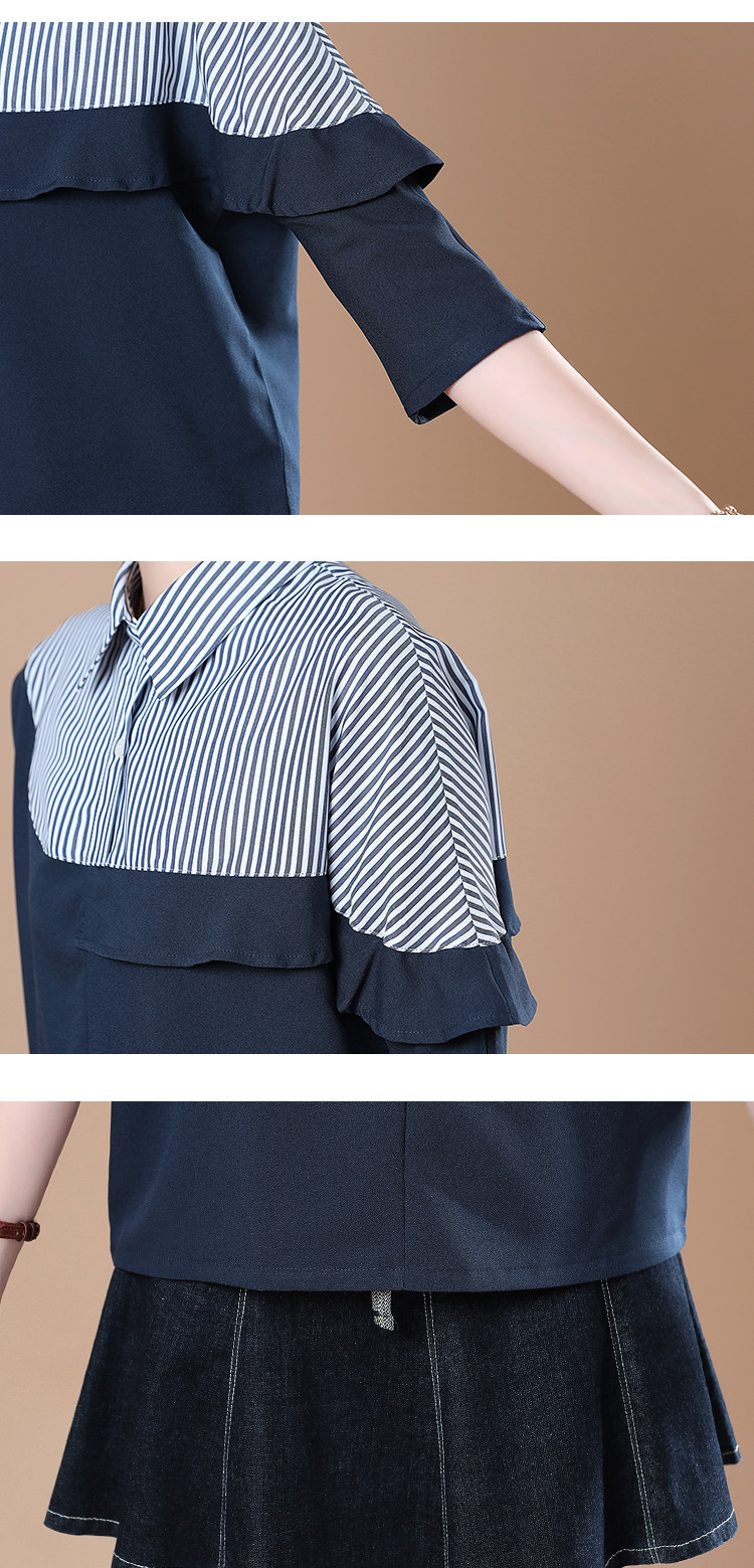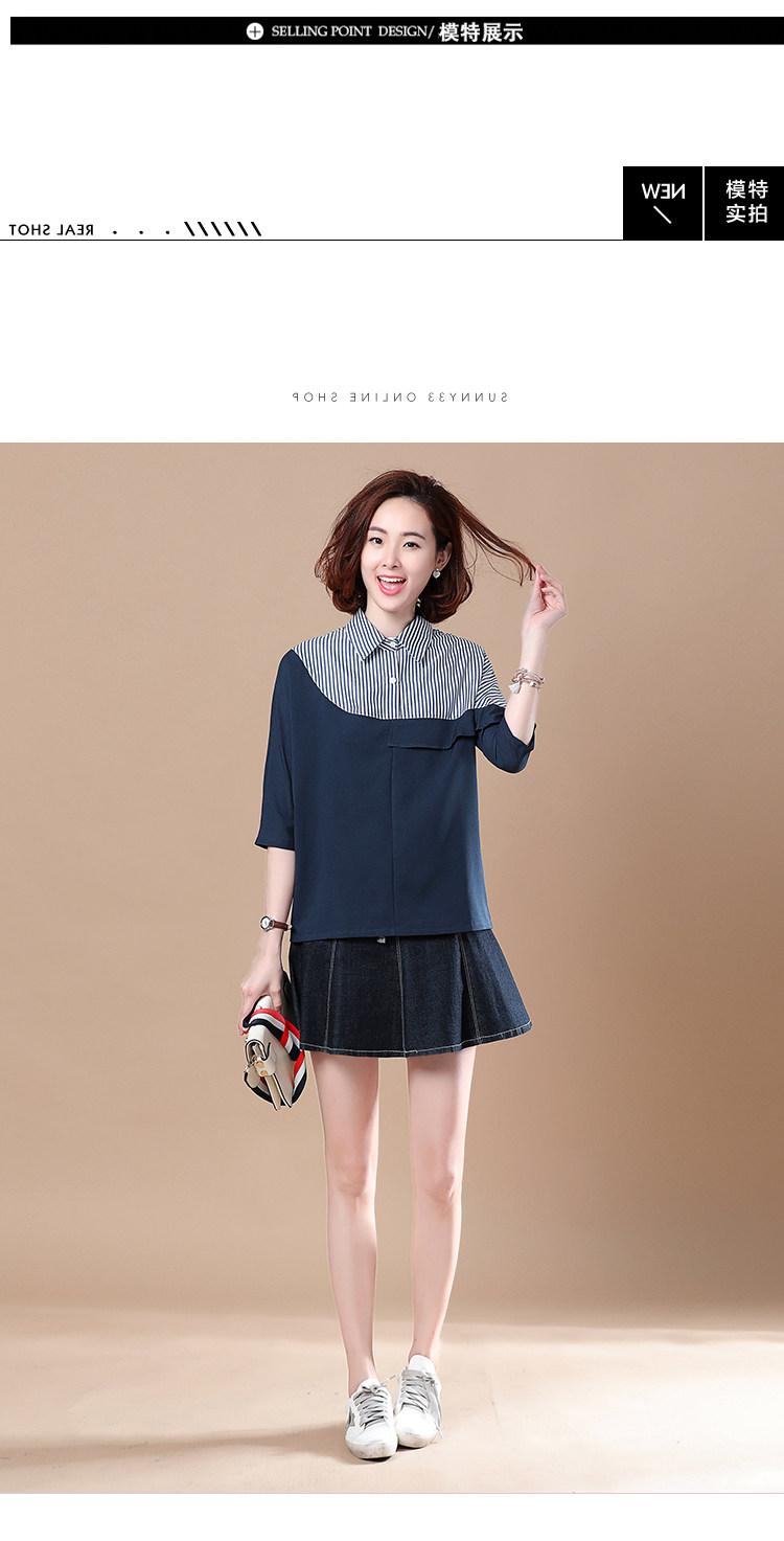 >> 實拍現貨胖mm大碼女裝夏季新款條紋拼接雪紡襯衣短袖t恤