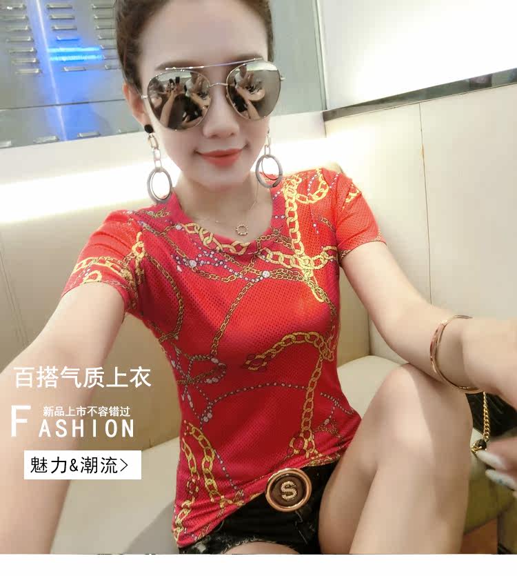 >> 實拍歐洲站2018新款夏女裝時尚百搭印花圓領短袖網洞T恤