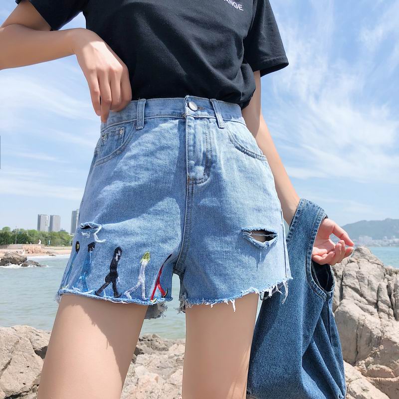 >> 實拍 實價~已檢測 新款繡花水洗磨破牛仔短褲寬鬆顯瘦闊腿褲熱褲