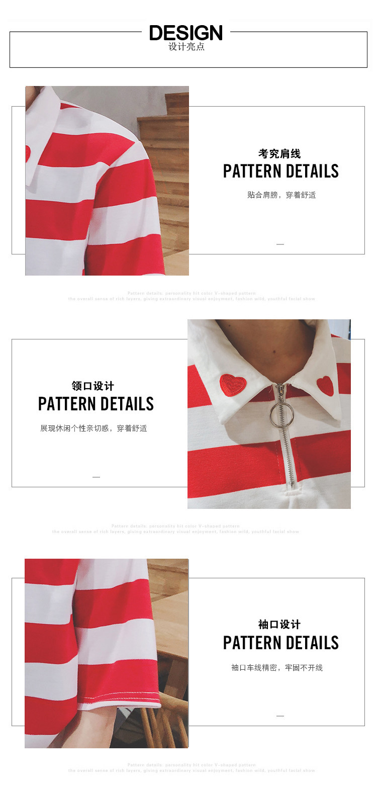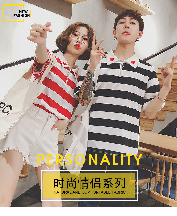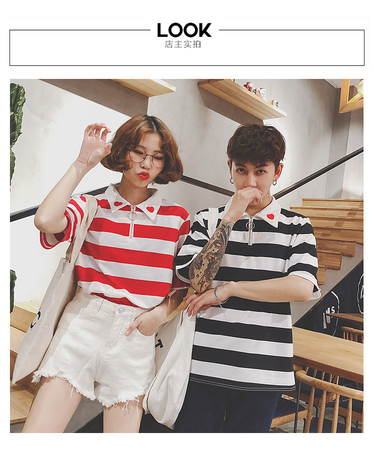 >> 實拍夏季學院風條紋polo衫愛心刺繡學生情侶裝短袖T恤班服