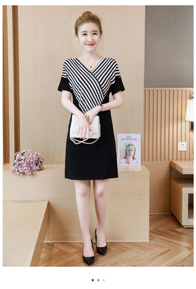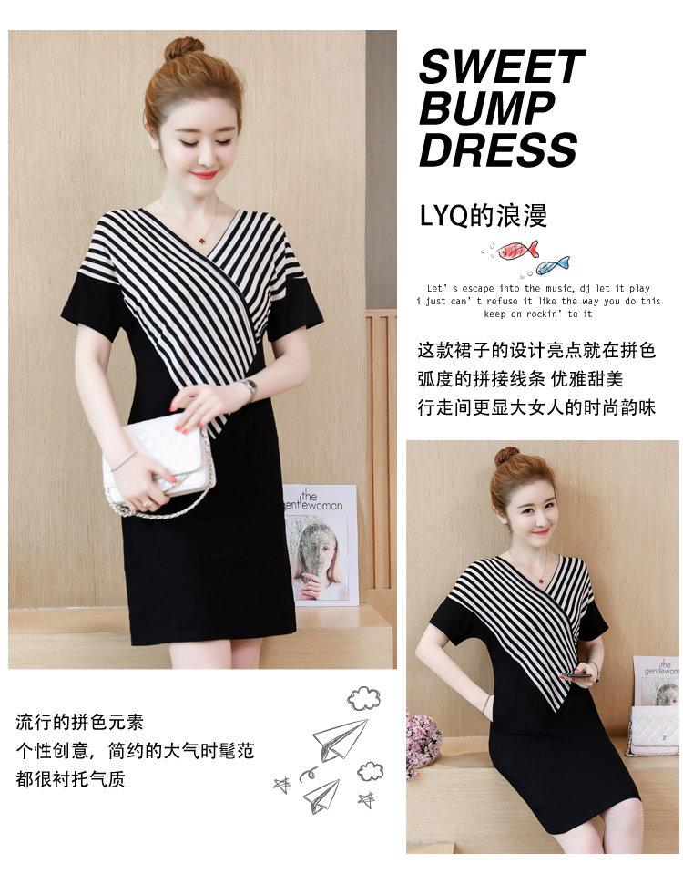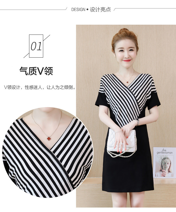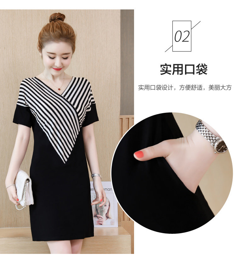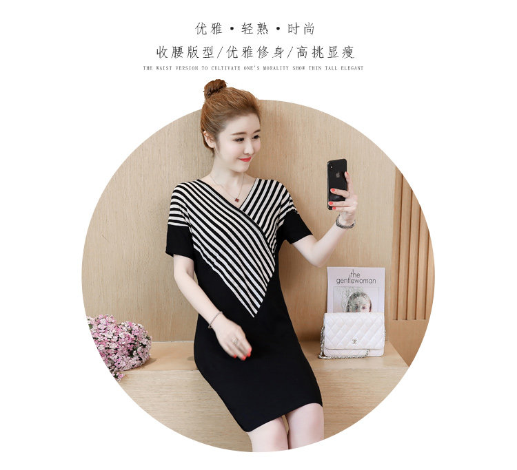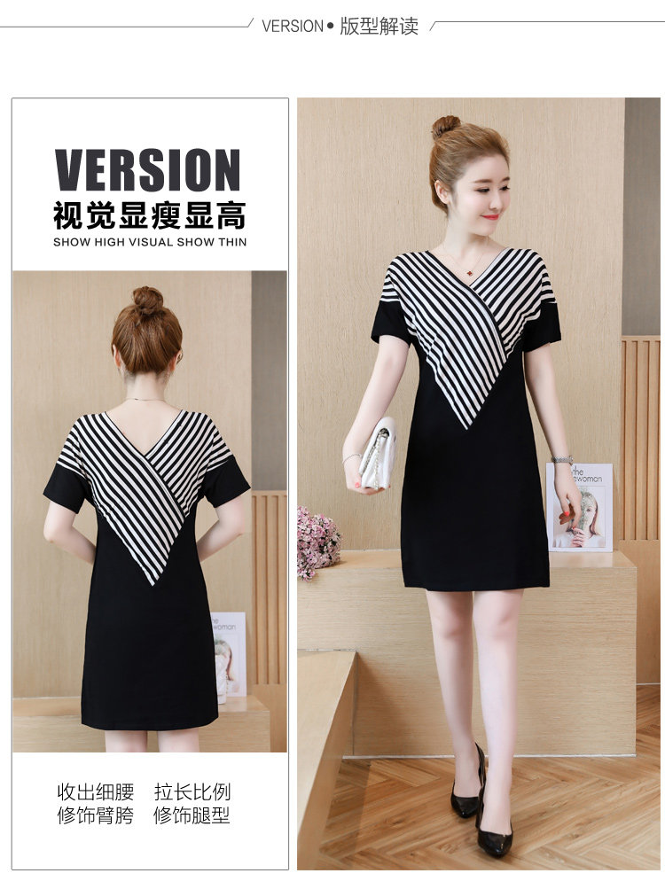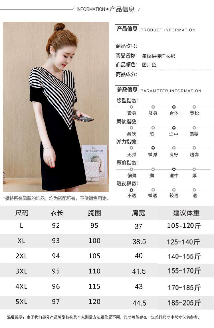>> 實拍大碼女裝2018新款夏裝胖mm顯瘦遮肚子藏肉V領條紋拼接連衣裙