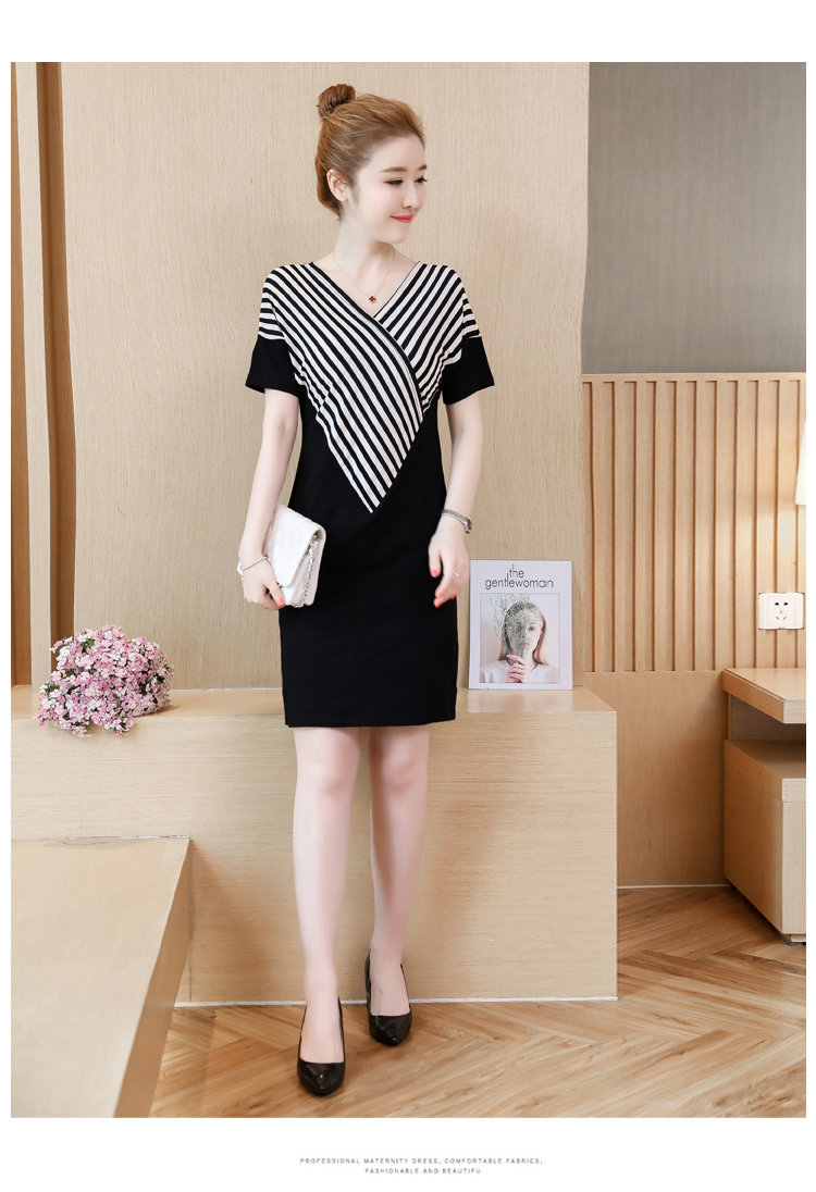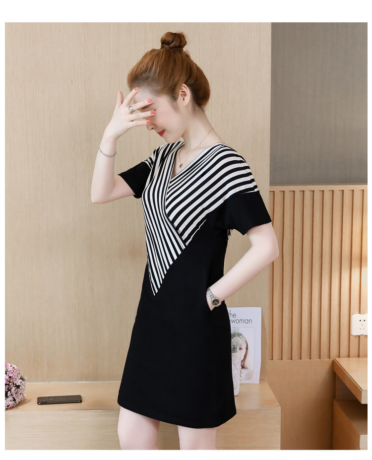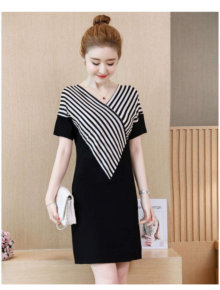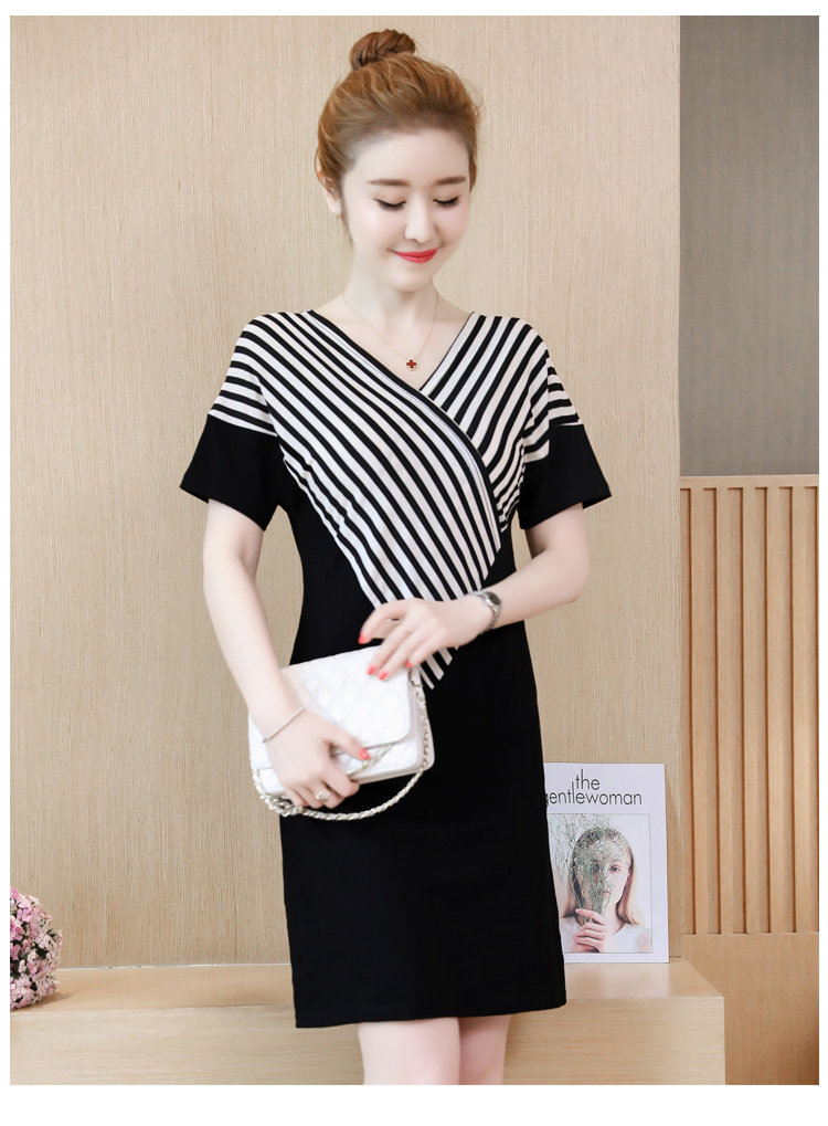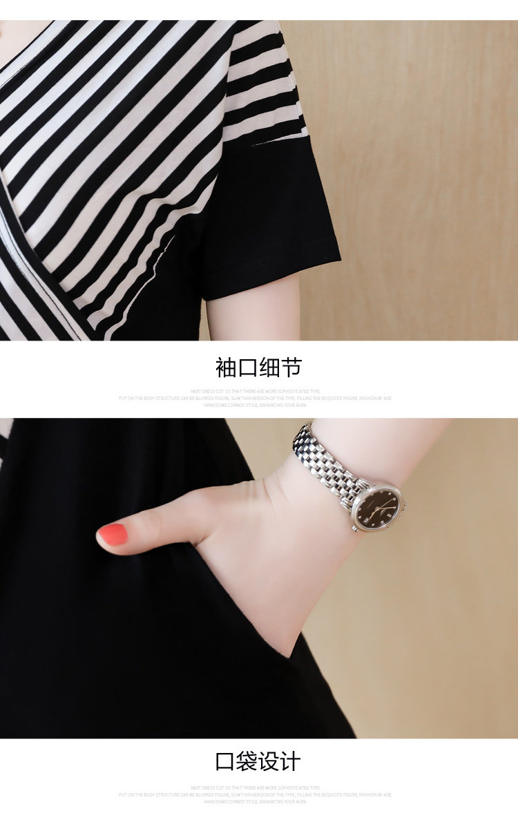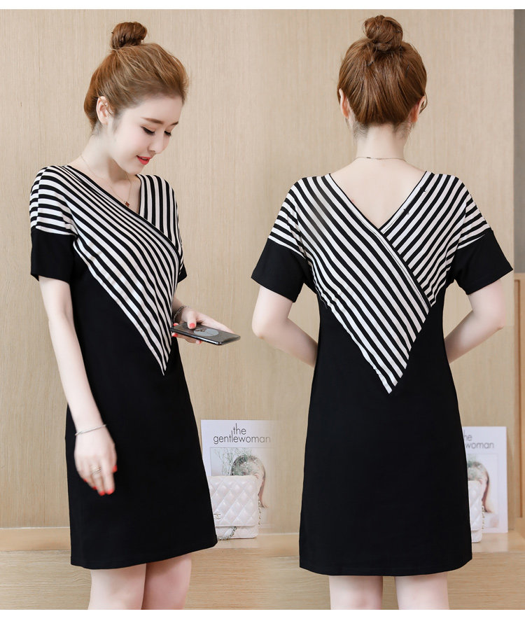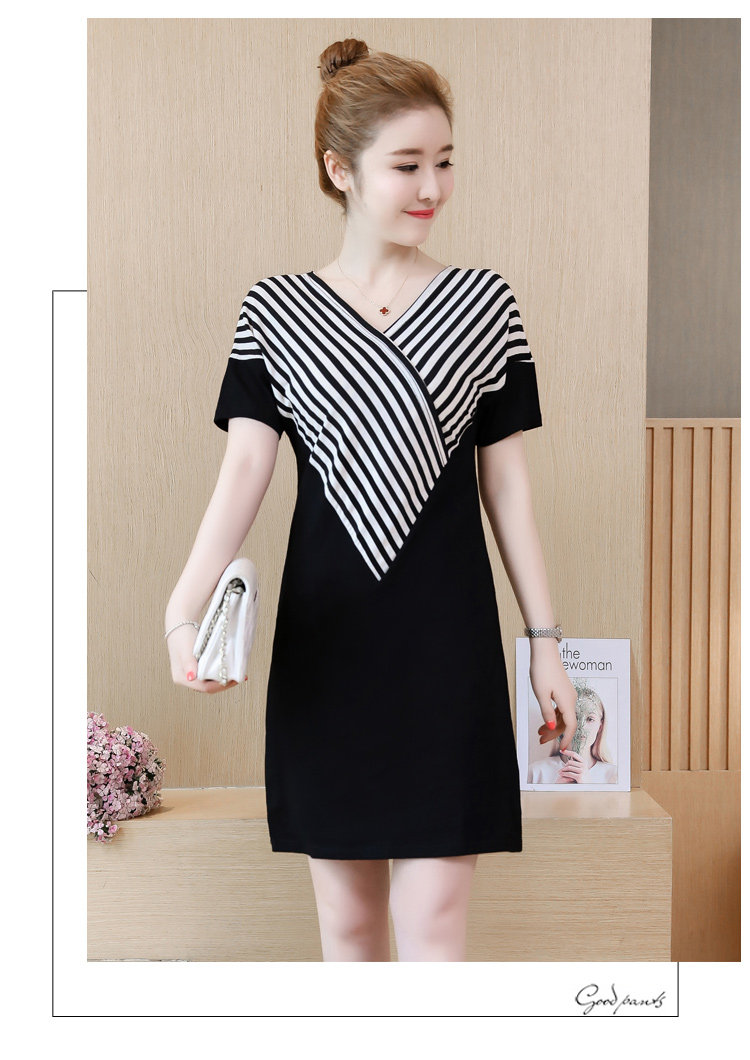>> 實拍大碼女裝2018新款夏裝胖mm顯瘦遮肚子藏肉V領條紋拼接連衣裙