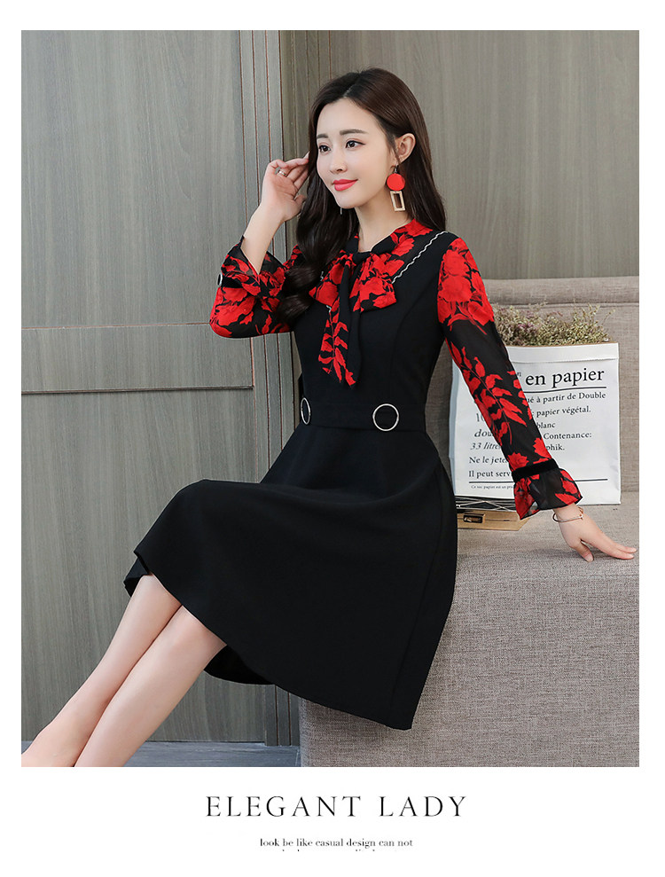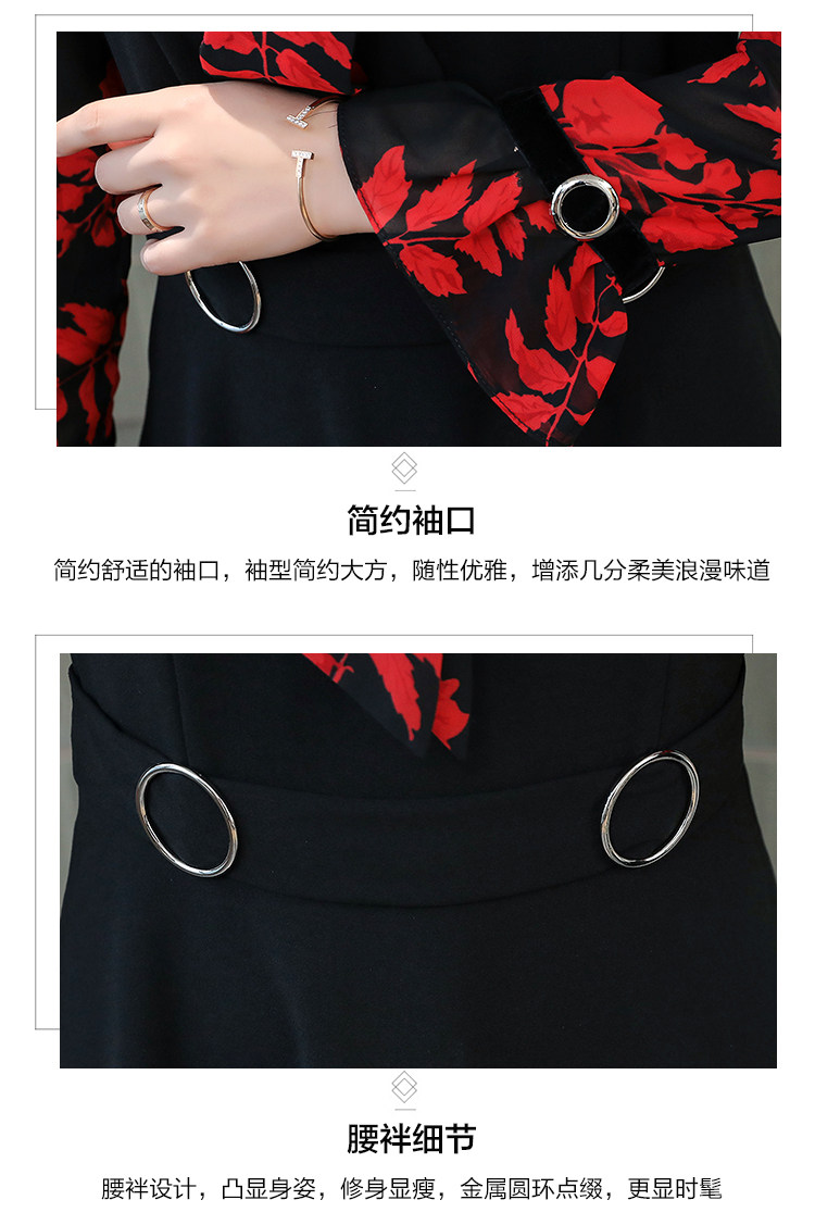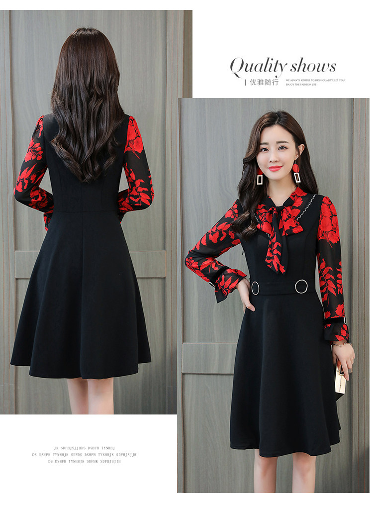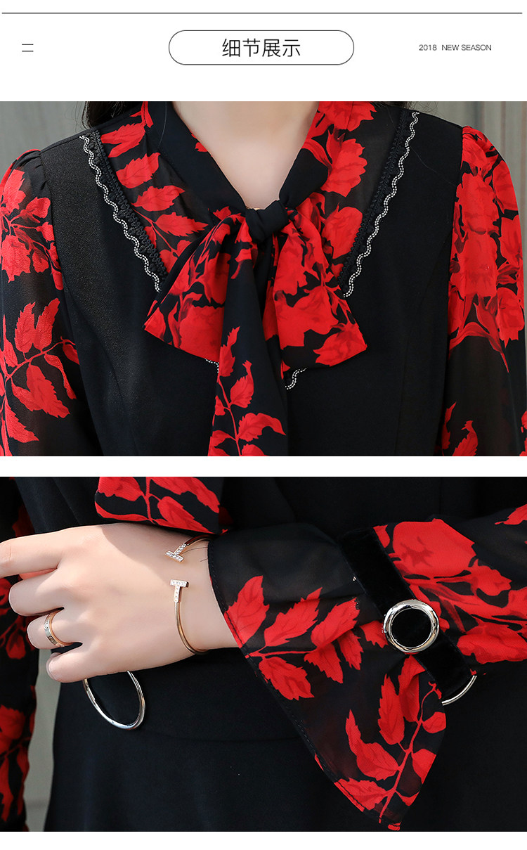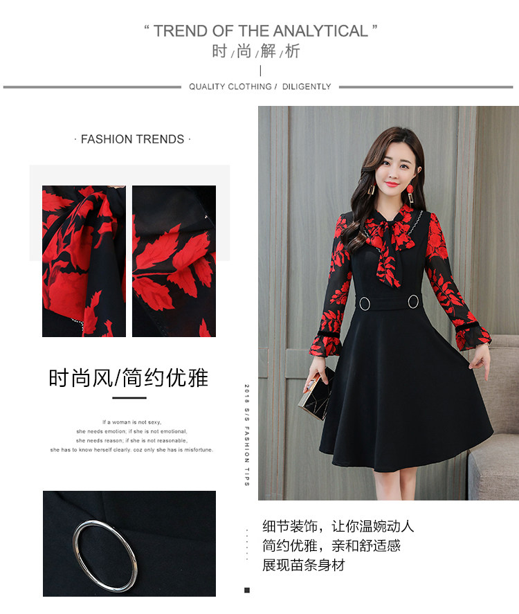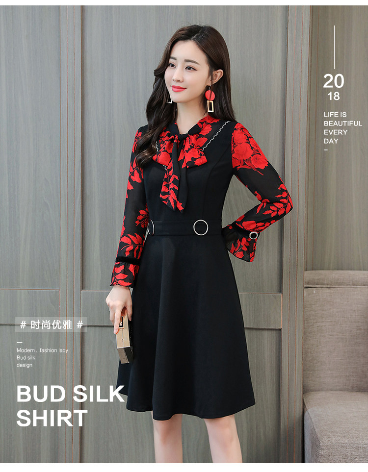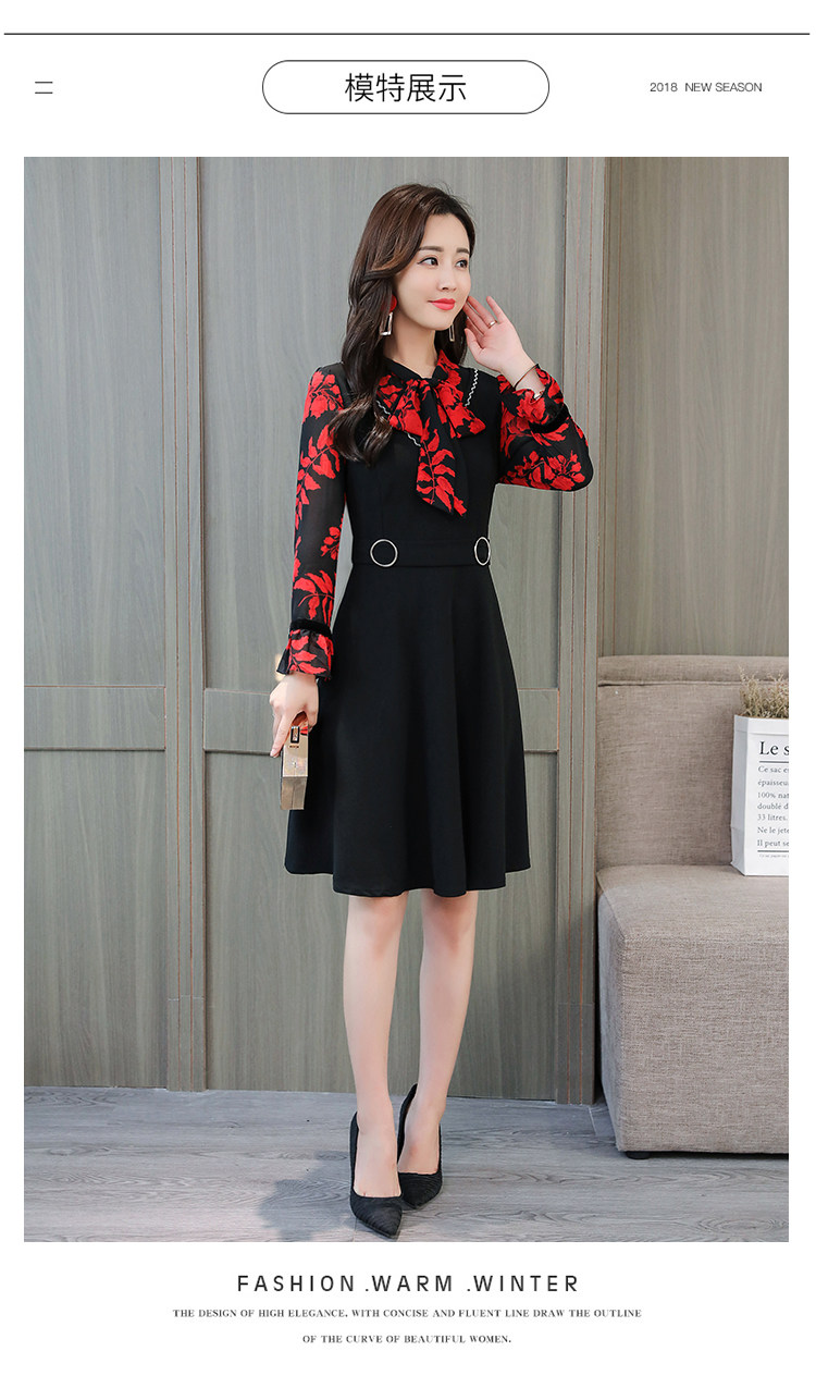 >> 實拍中長款修身v領連衣裙秋冬季女裝2018新款韓版印花氣質裙子潮