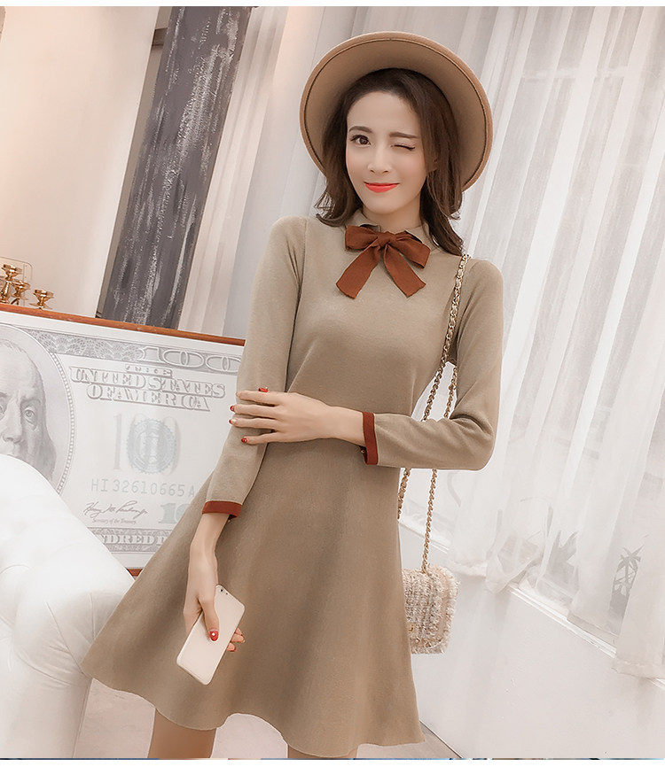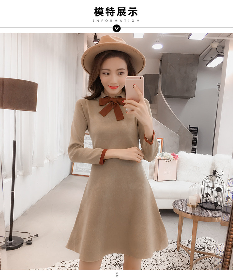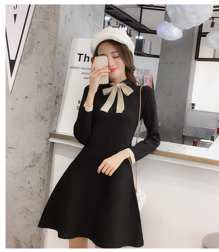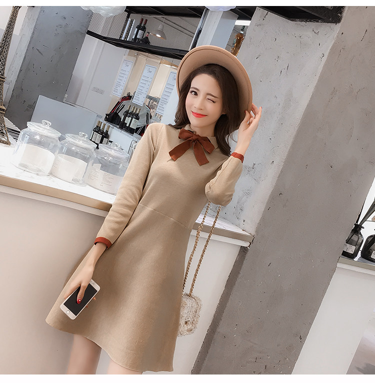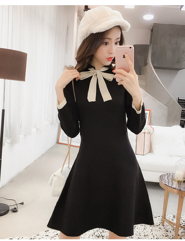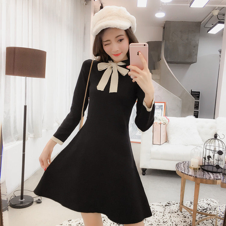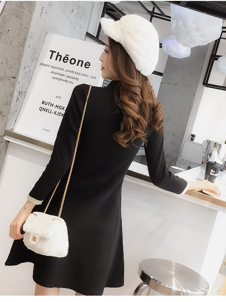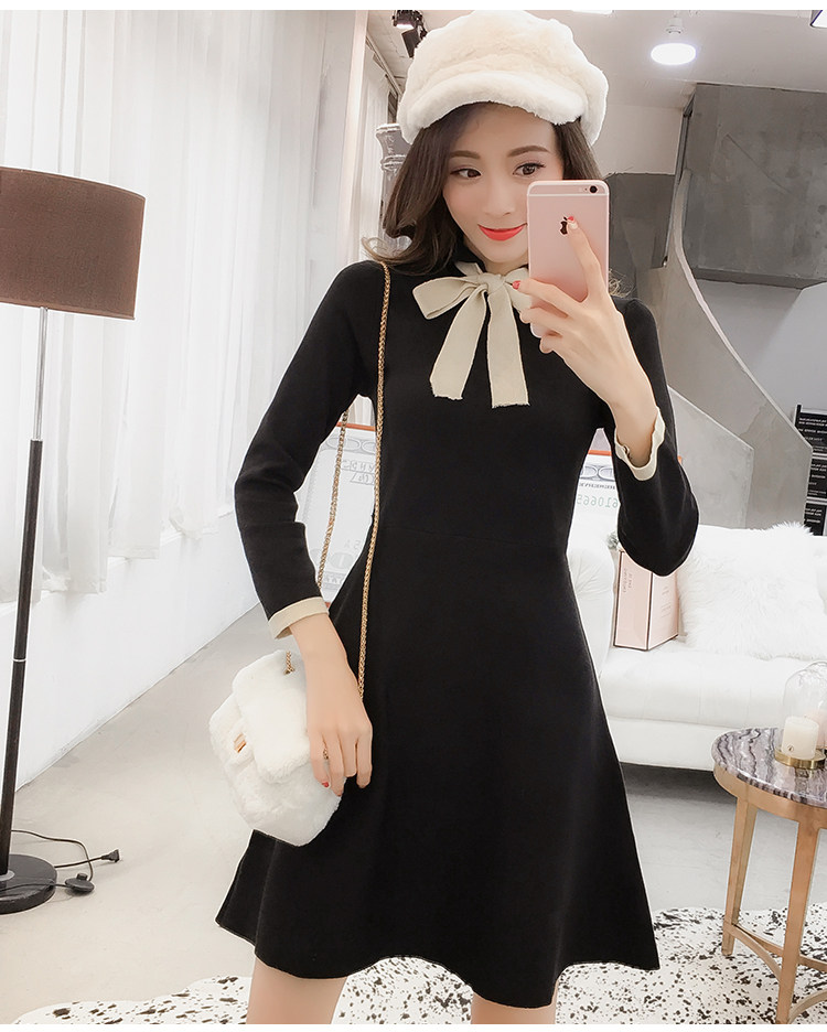 >> 新款韓版長袖拼色修身內搭針織連衣裙打底a字裙