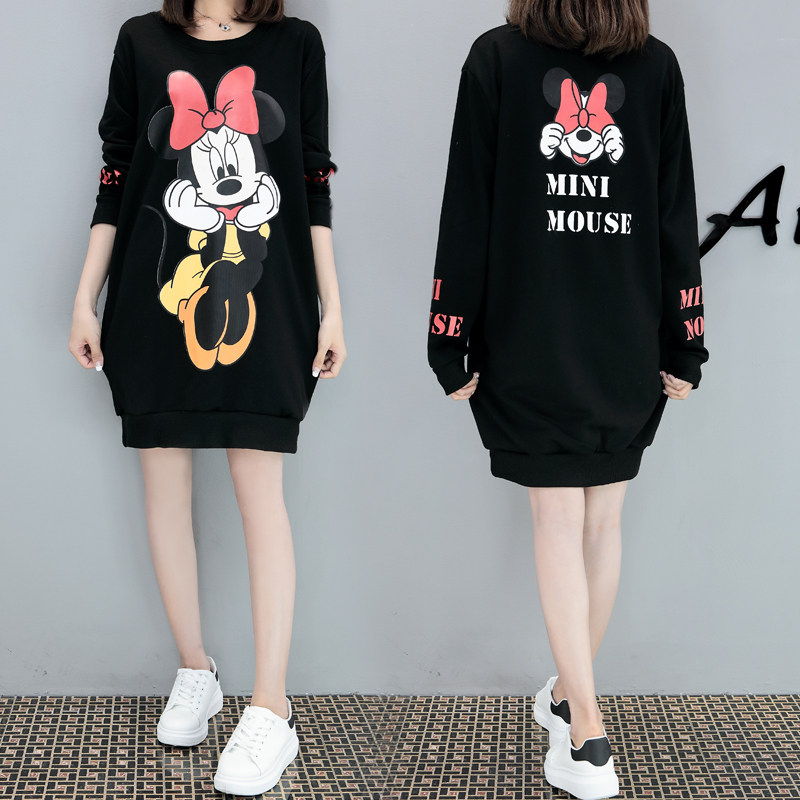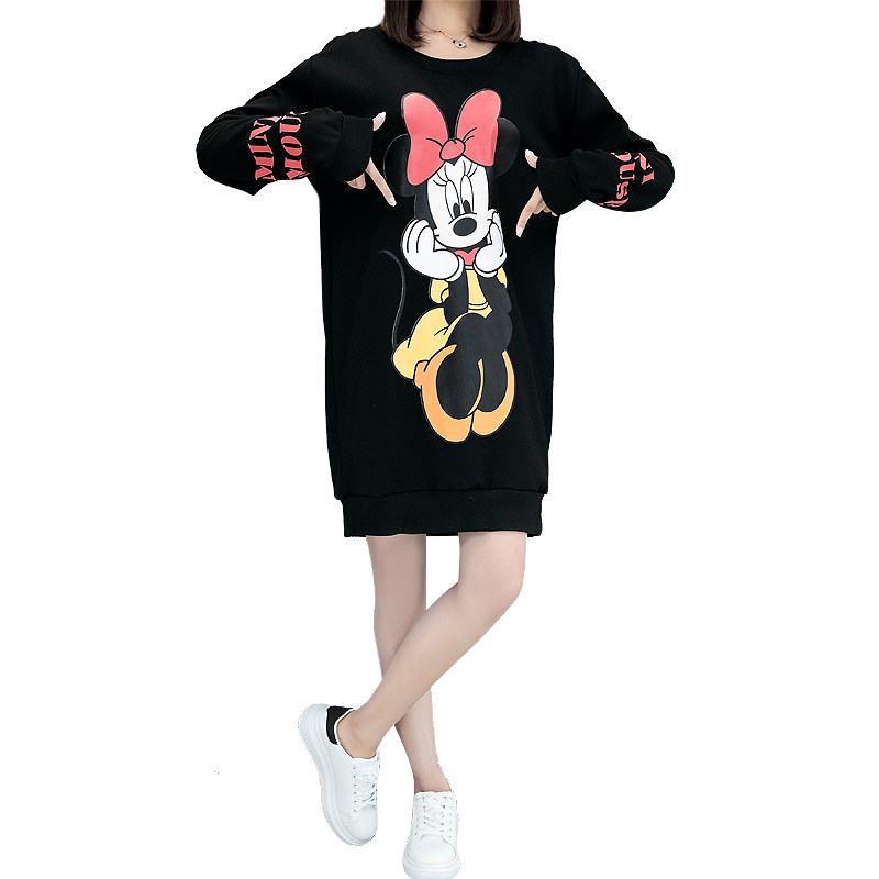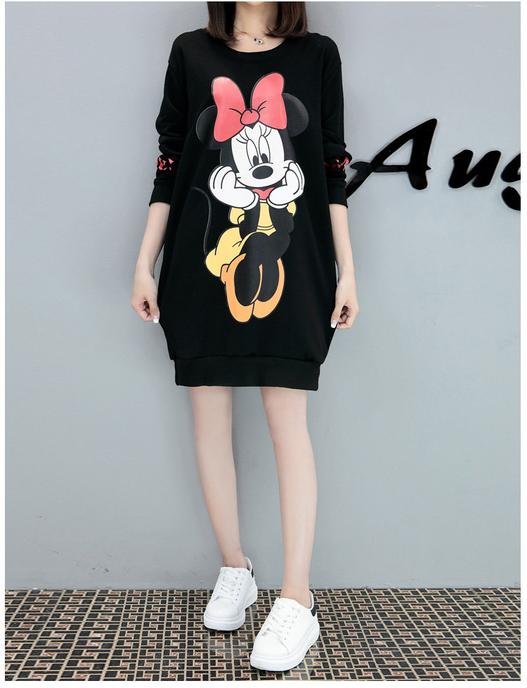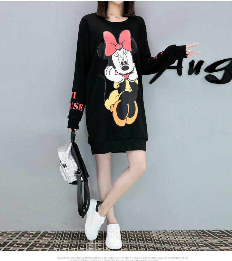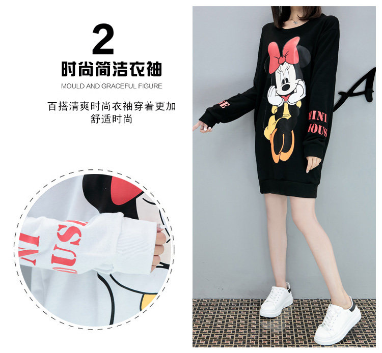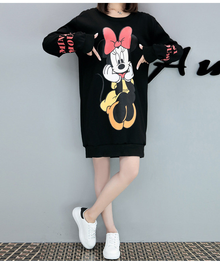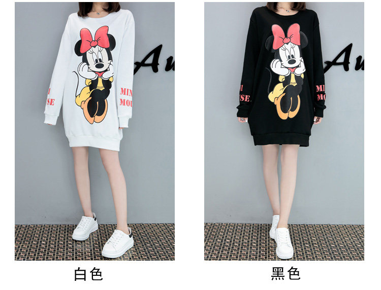 >> 實拍秋季新款韓版卡通米奇中長款純棉加絨長袖連衣裙女