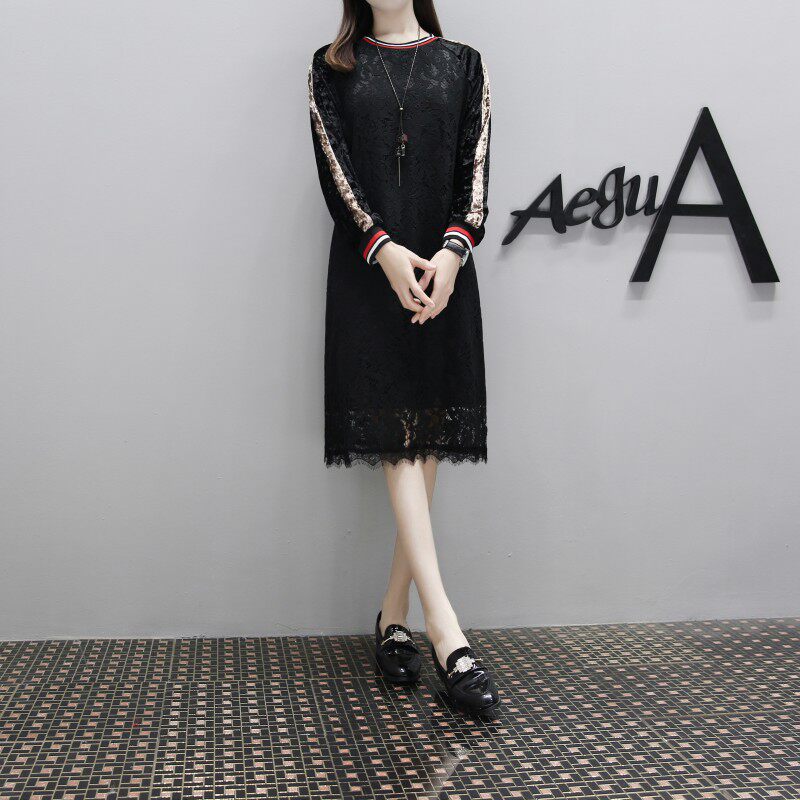 >> 2019春秋新款胖MM大碼女裝絲絨拼接顯瘦蕾絲連衣裙時尚遮肚打底裙