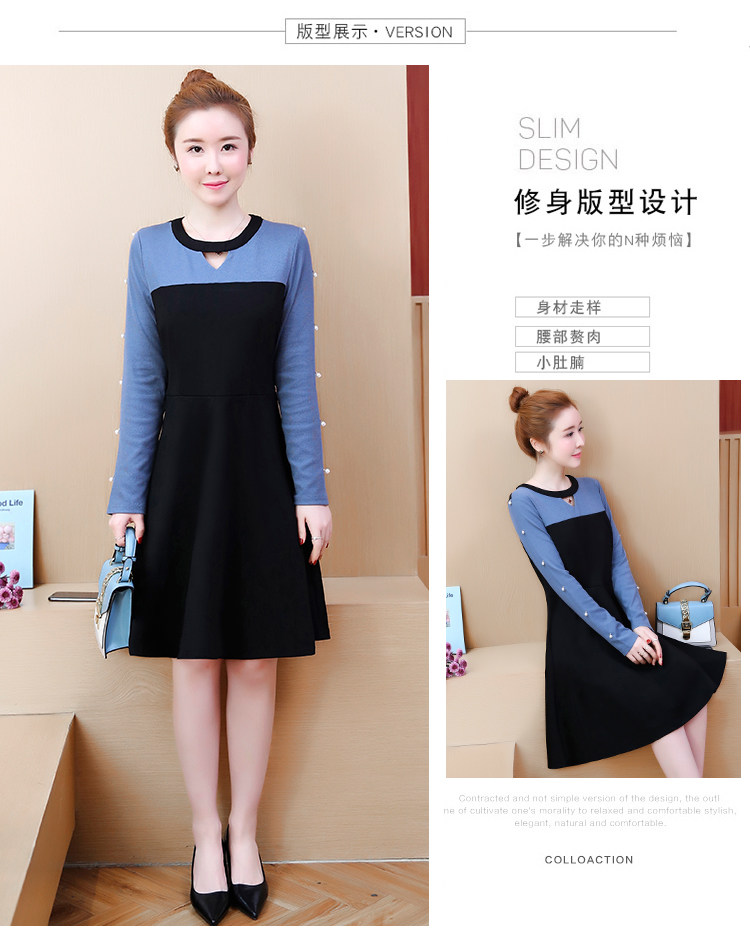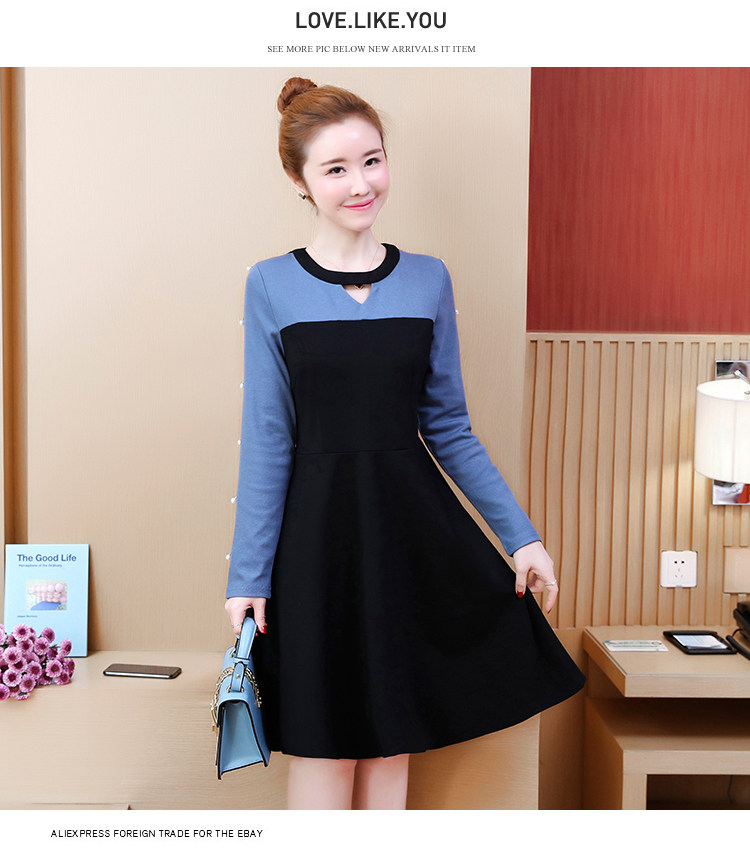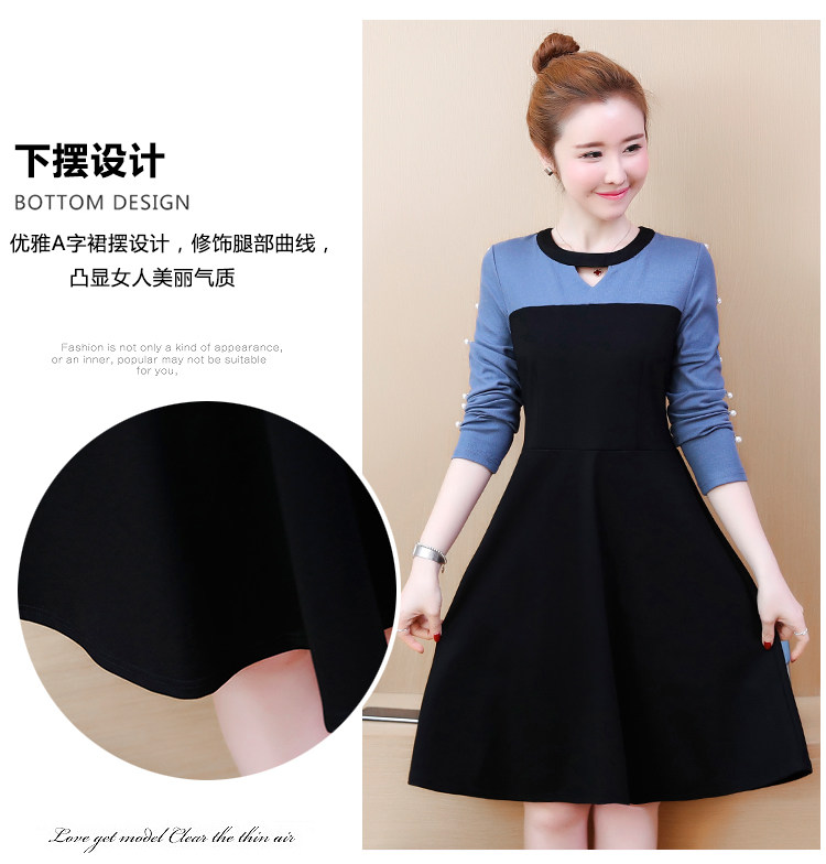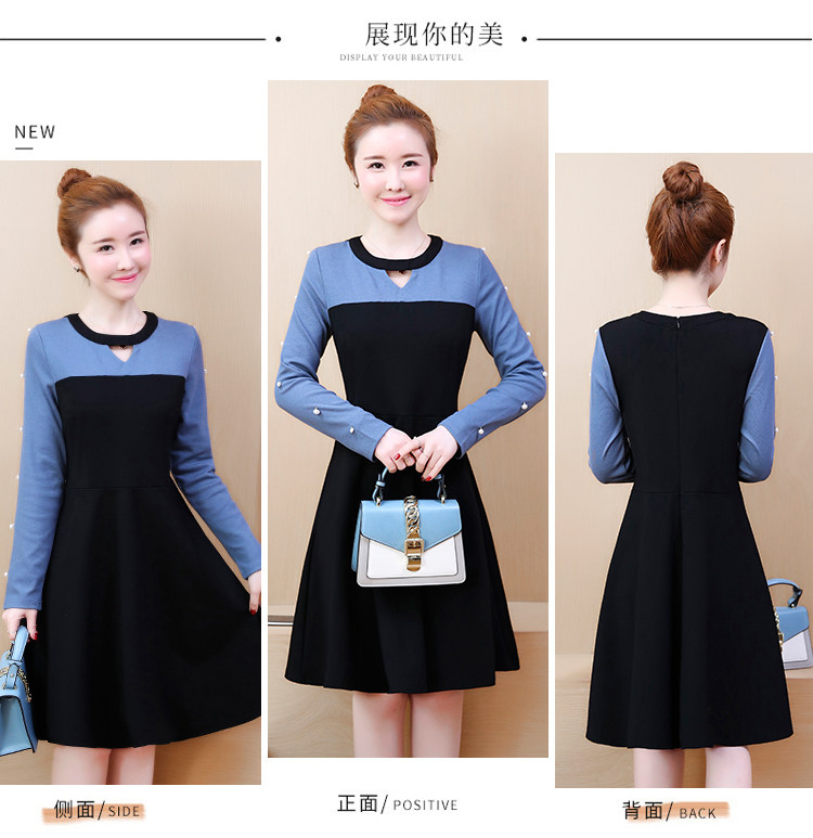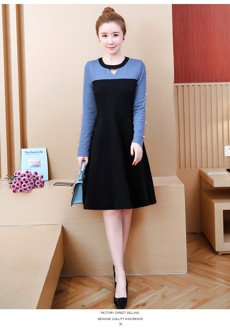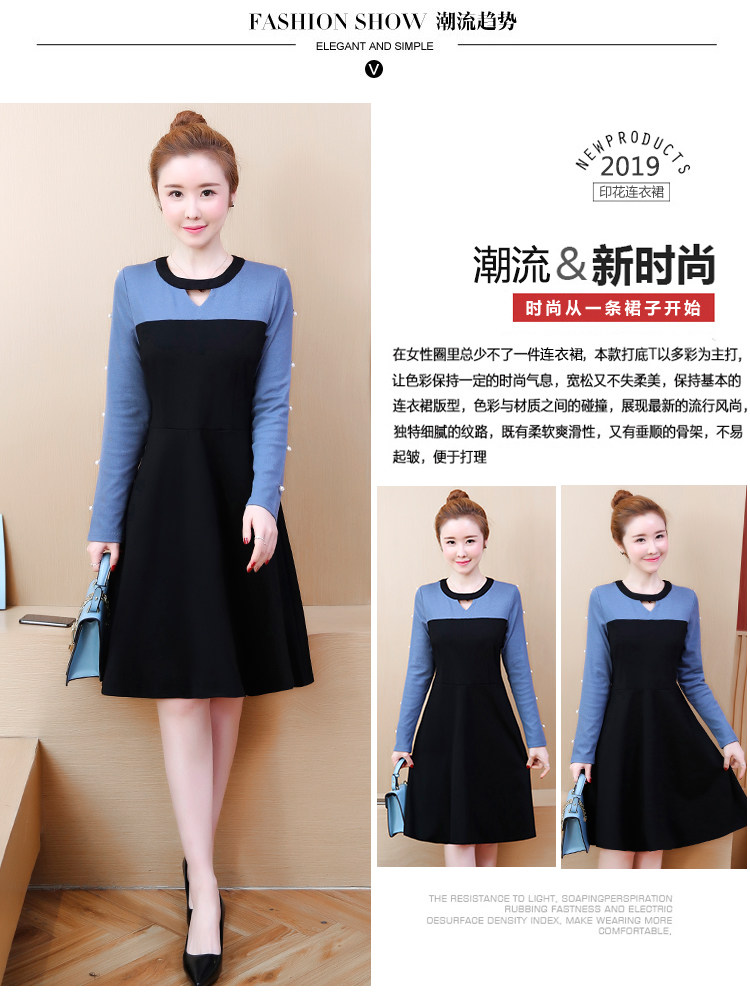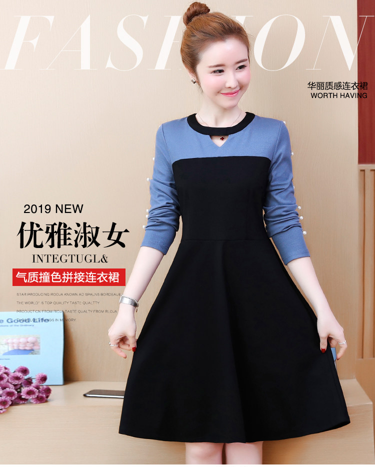 >> 實拍連衣裙長袖2019春裝新款大碼女裝休閒拼接撞色裙子A字連衣裙
