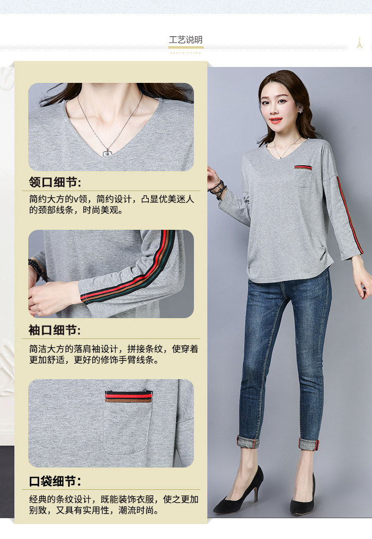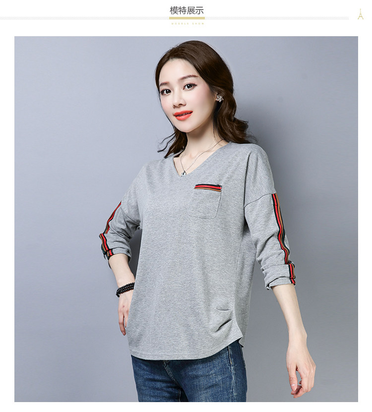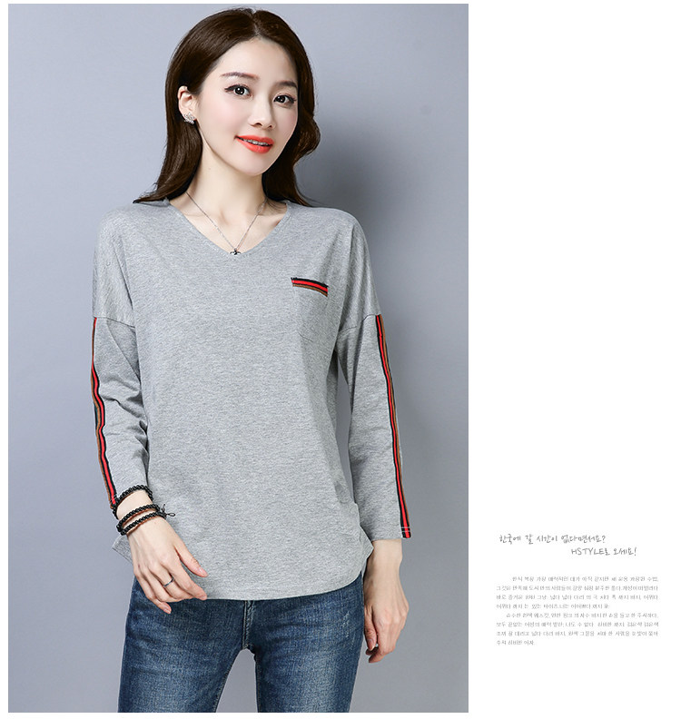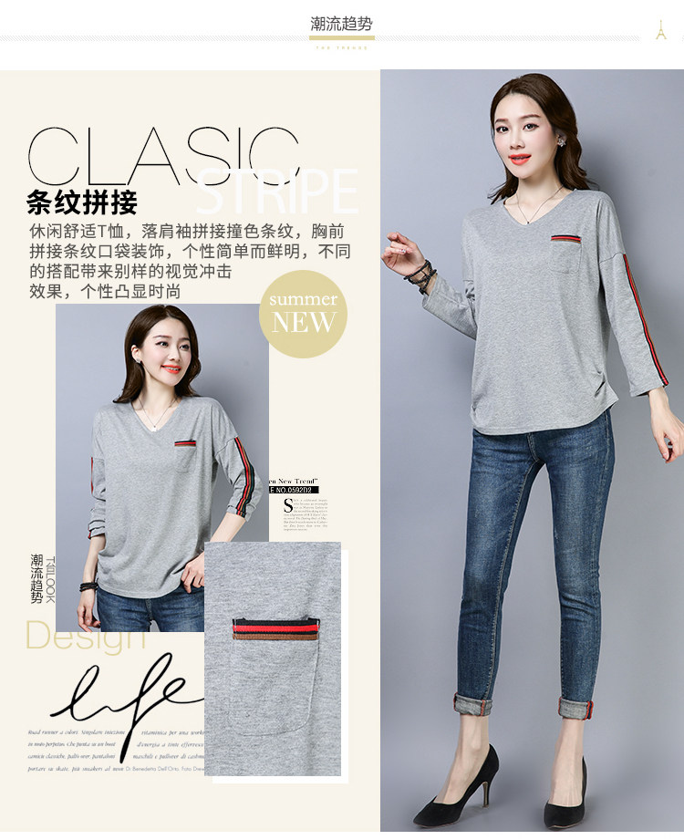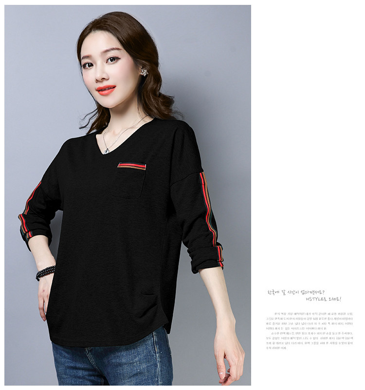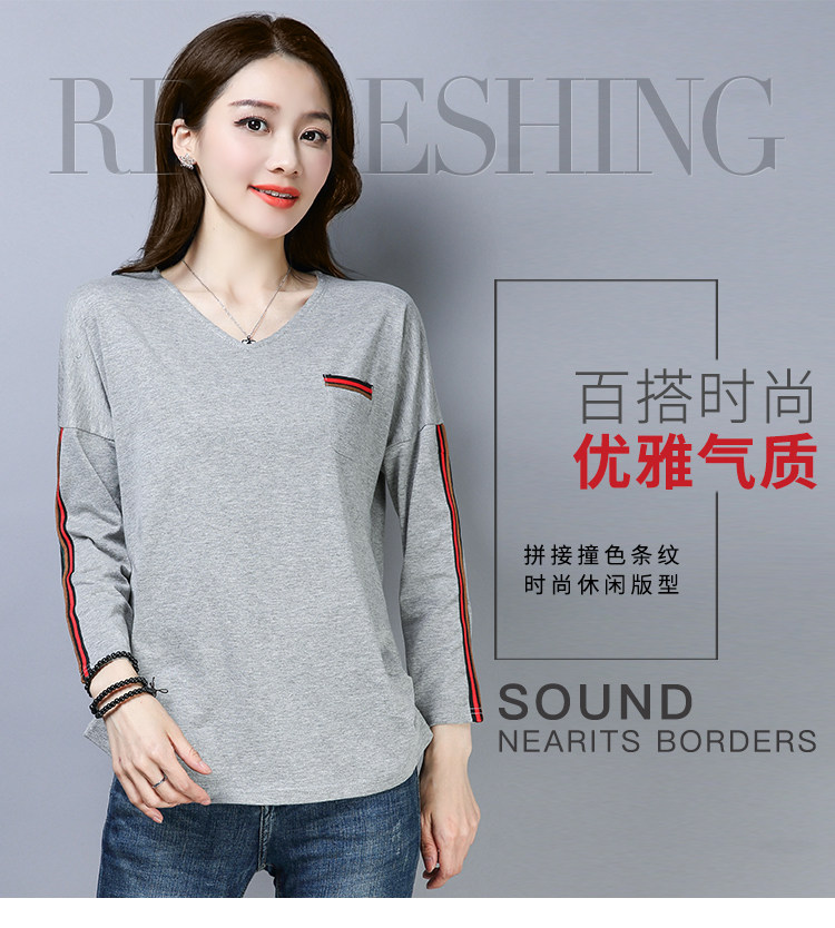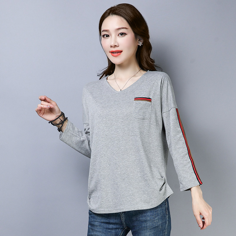 >> 2019春季大碼女裝簡約側條紋V領長袖棉T恤女春秋裝新款打底衫上衣