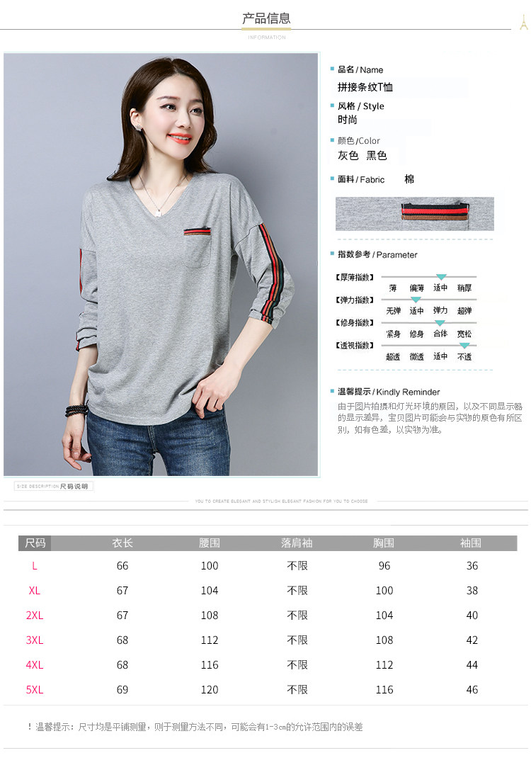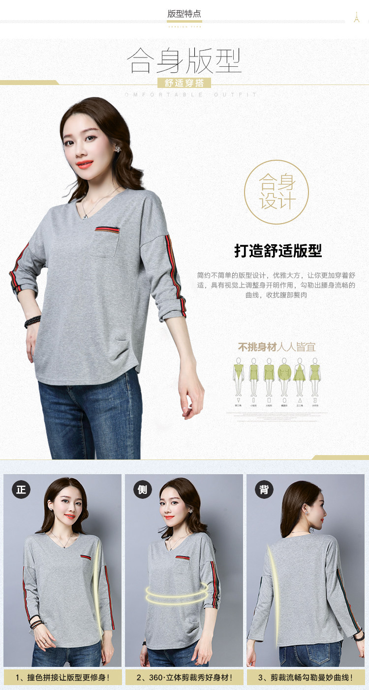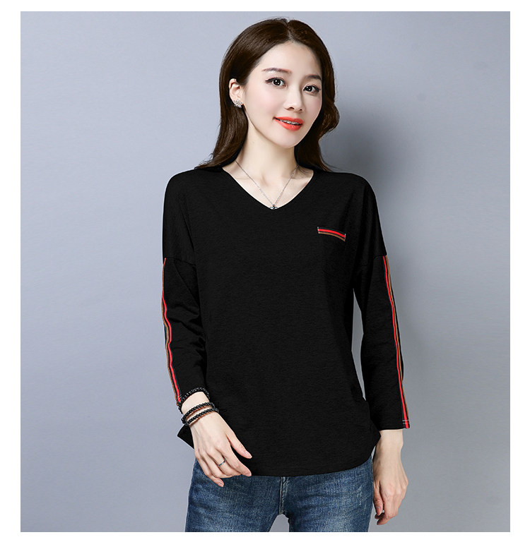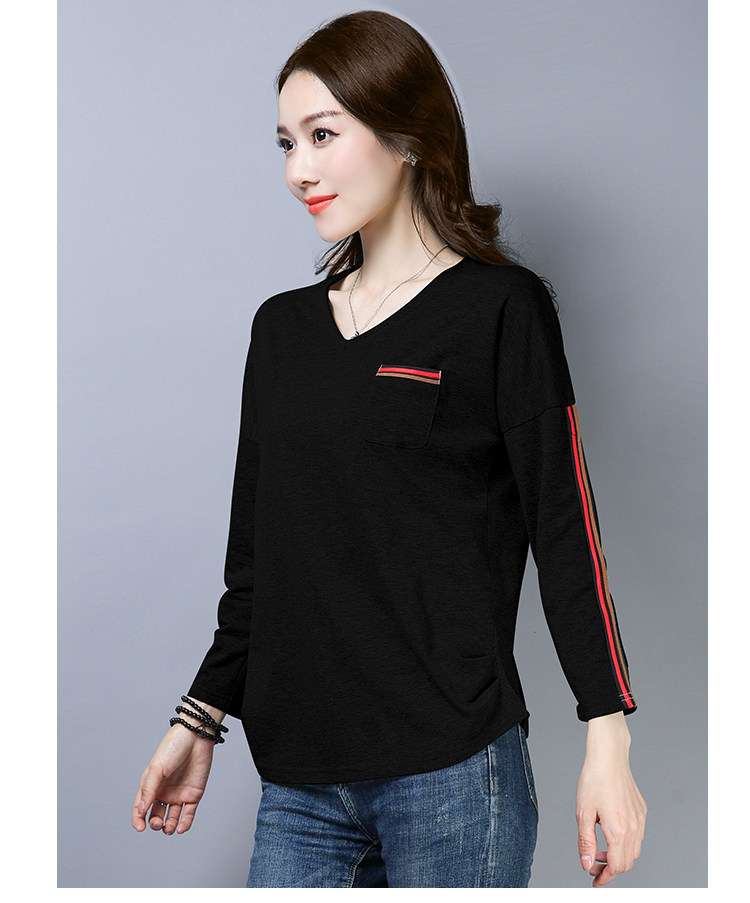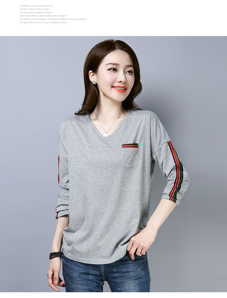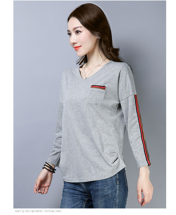 >> 2019春季大碼女裝簡約側條紋V領長袖棉T恤女春秋裝新款打底衫上衣