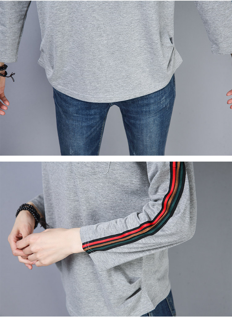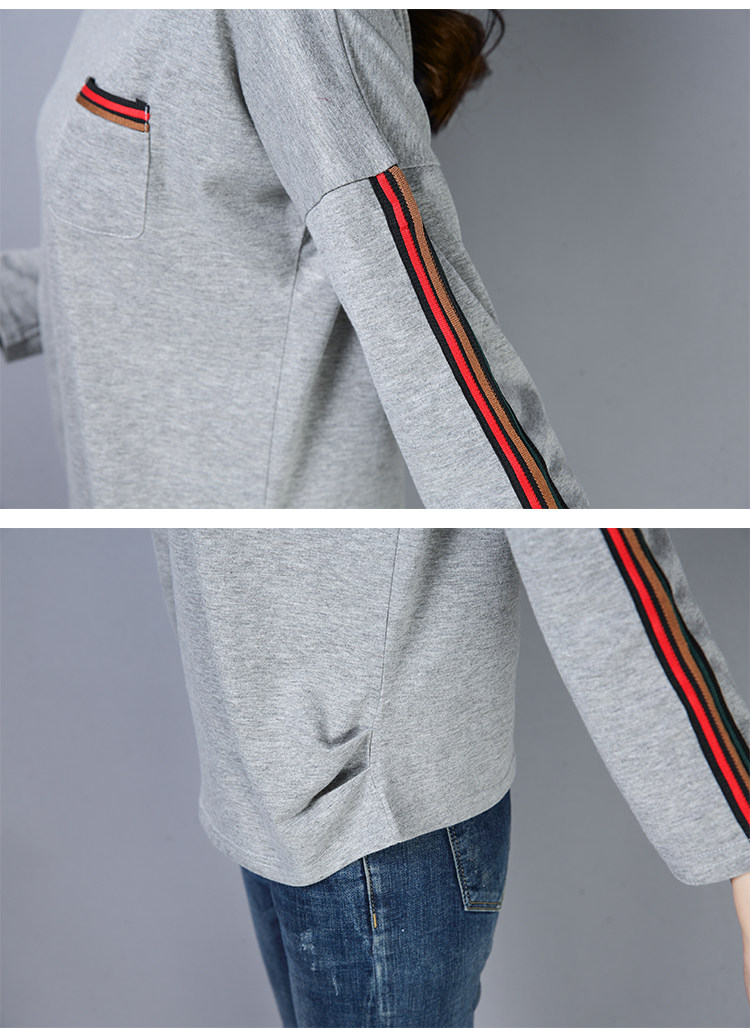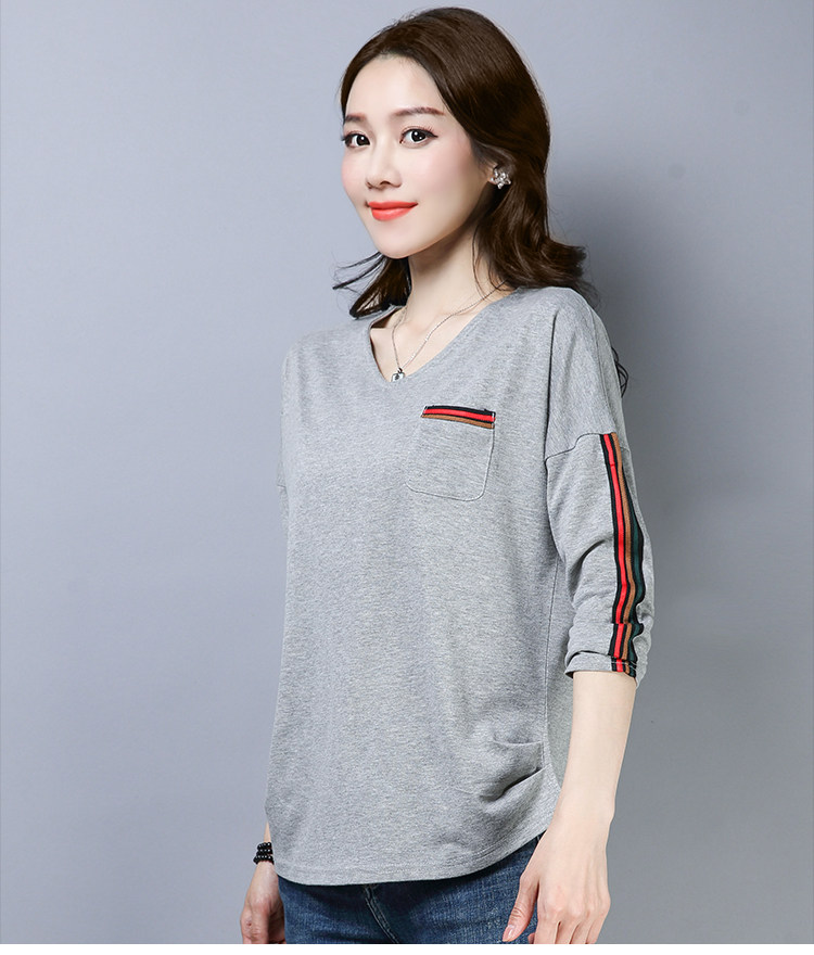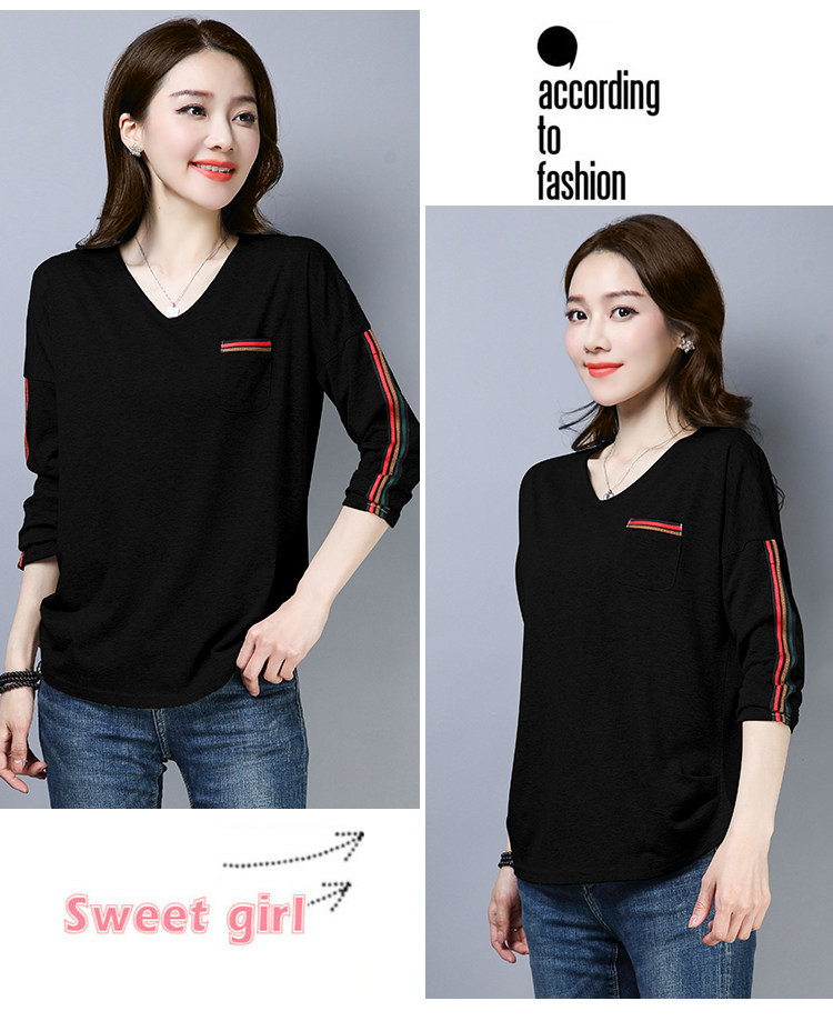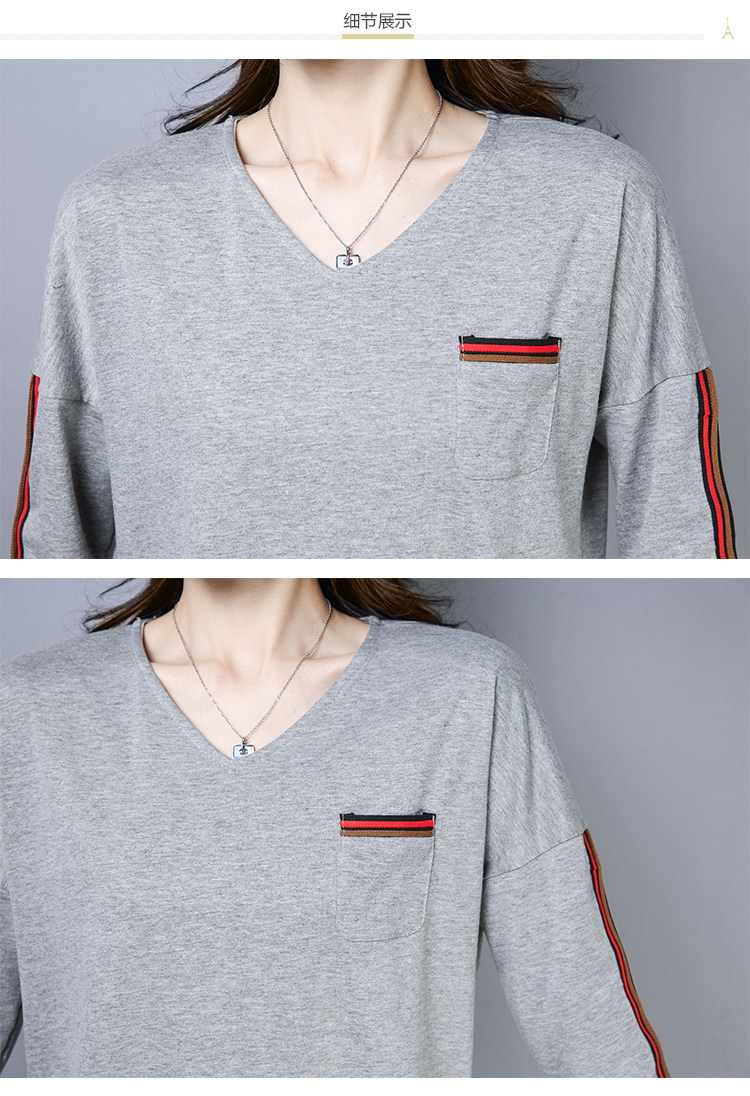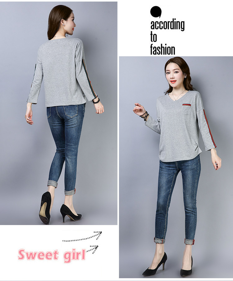 >> 2019春季大碼女裝簡約側條紋V領長袖棉T恤女春秋裝新款打底衫上衣