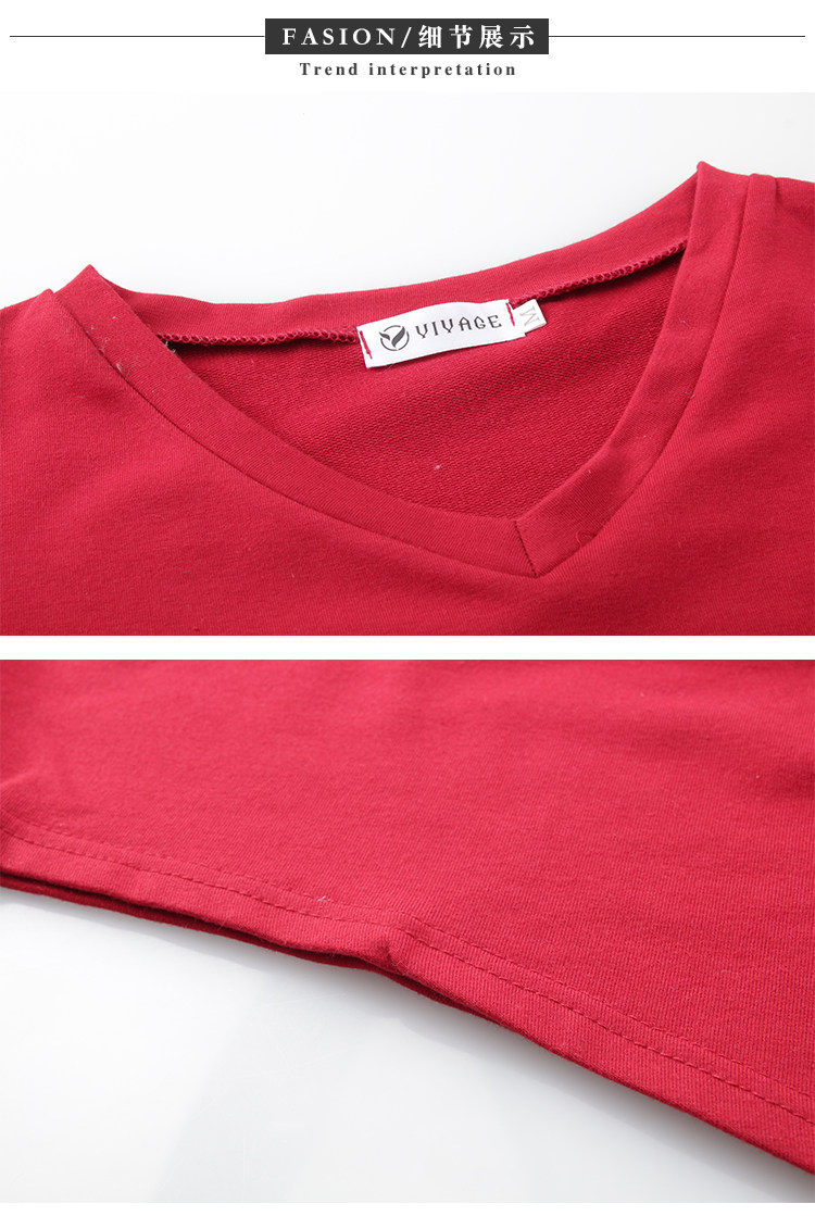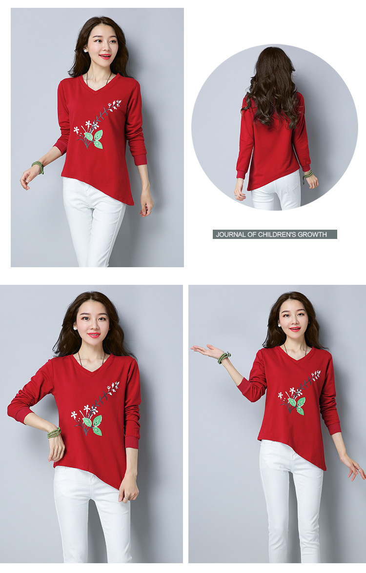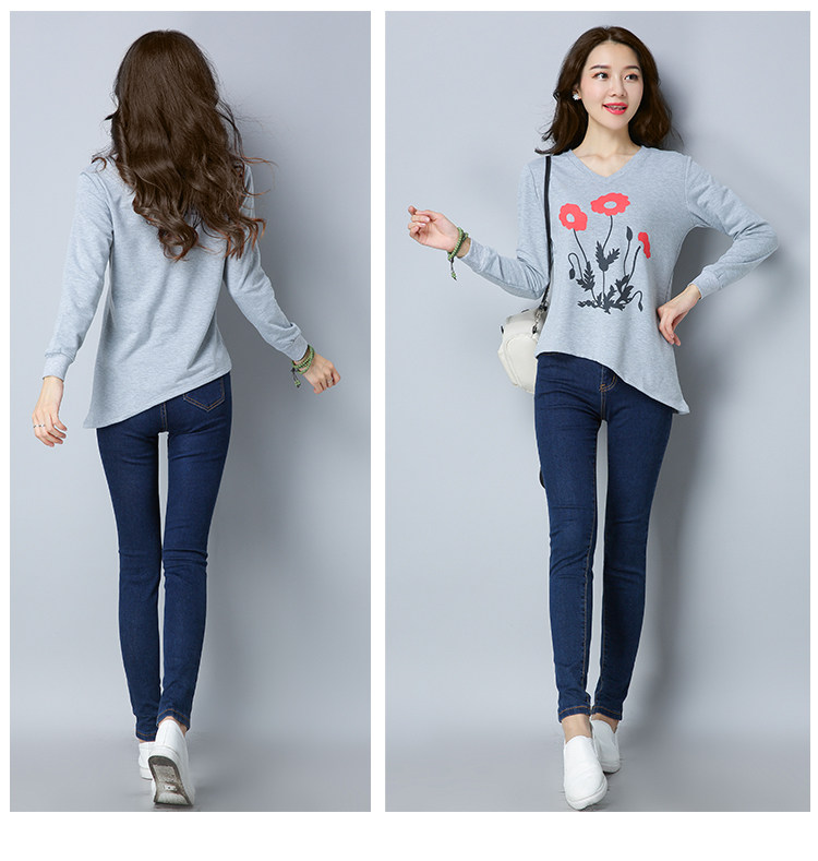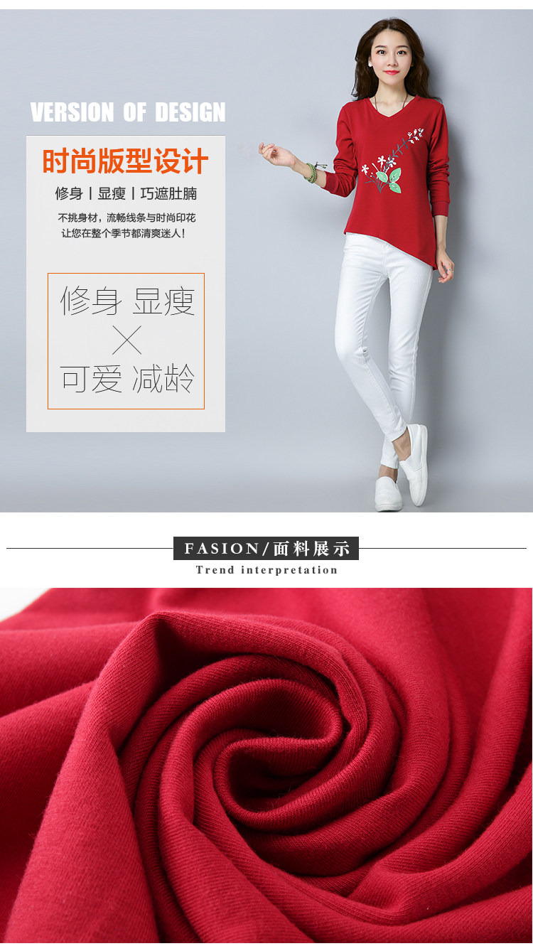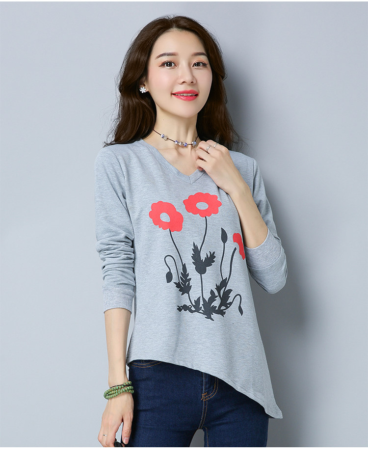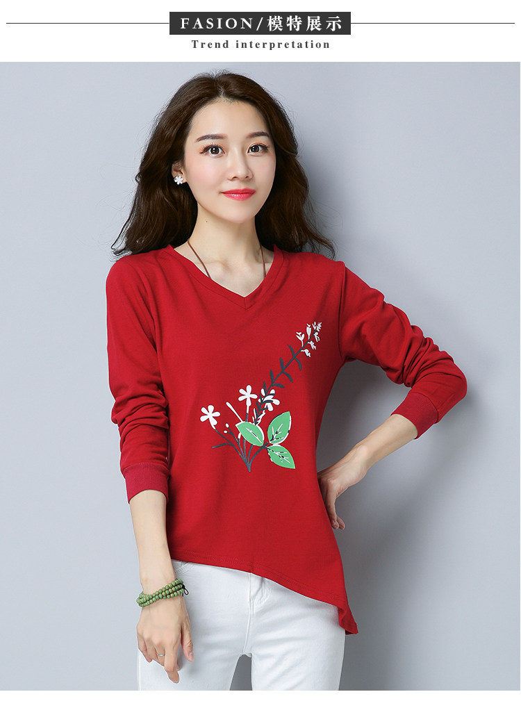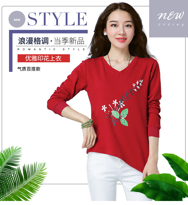 >> 實拍2019春季新款大碼女長袖上衣V領印花顯瘦減齡體恤打底衫