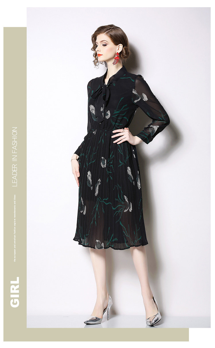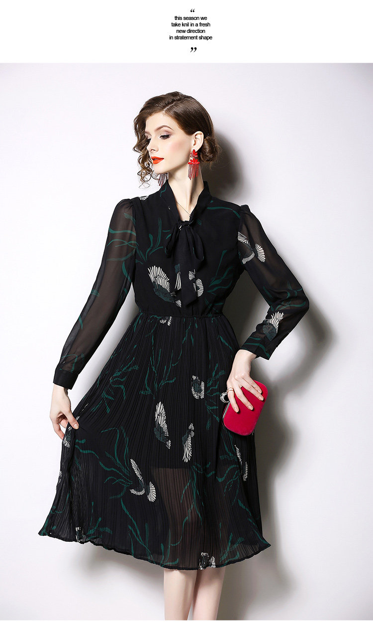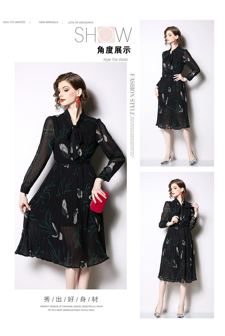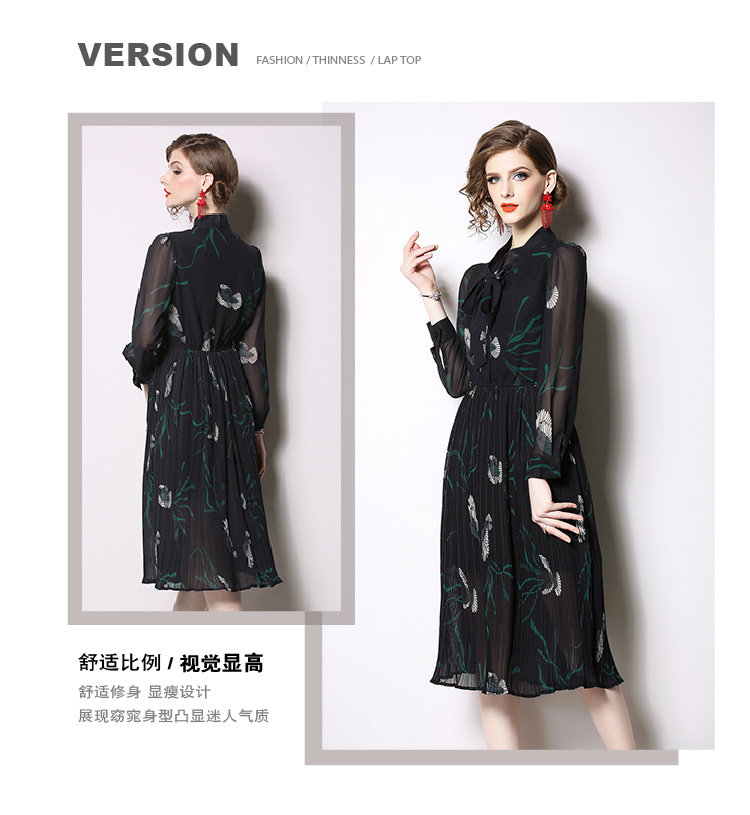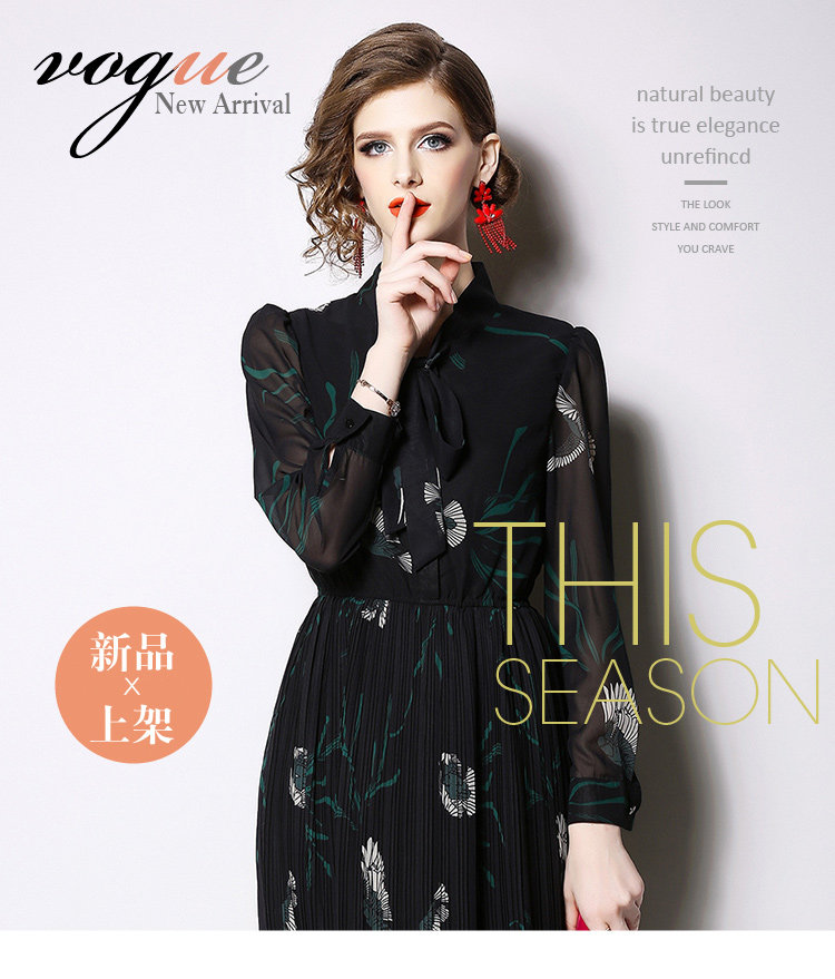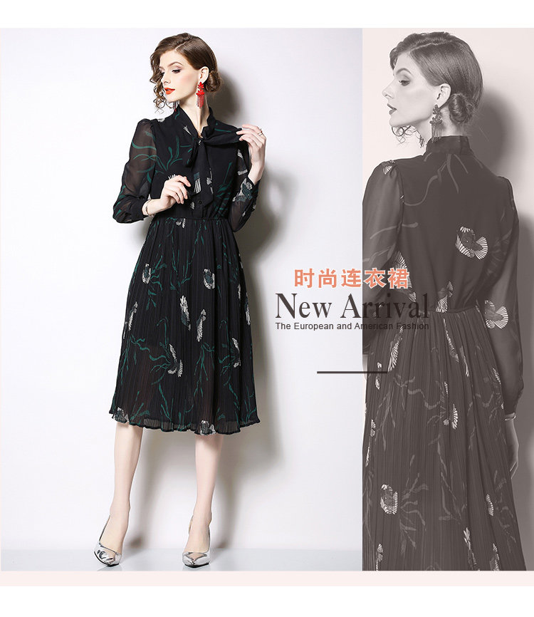 >> 歐洲站早春新款印花中長款連衣裙修身顯瘦打底裙