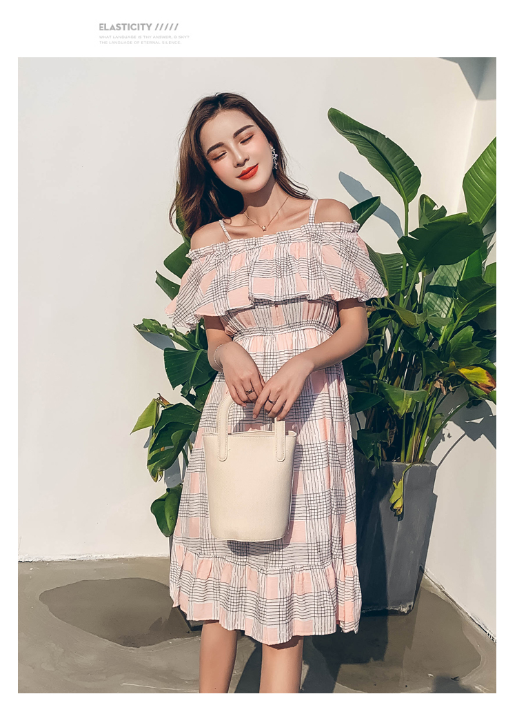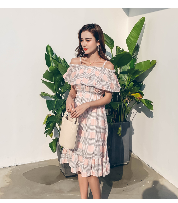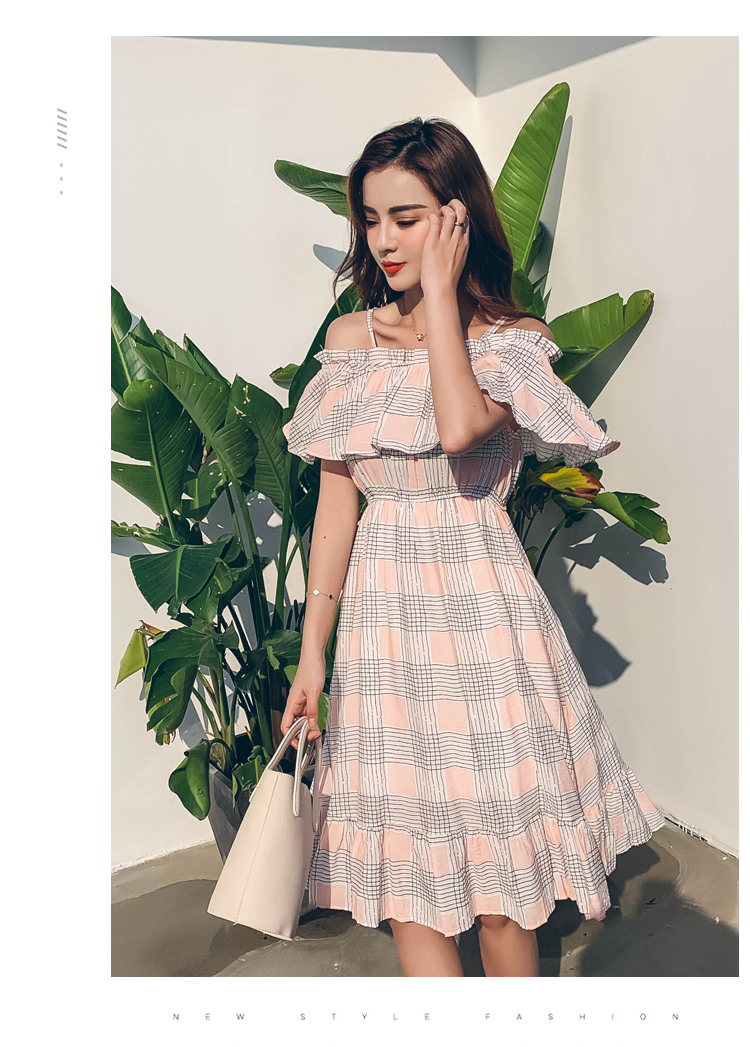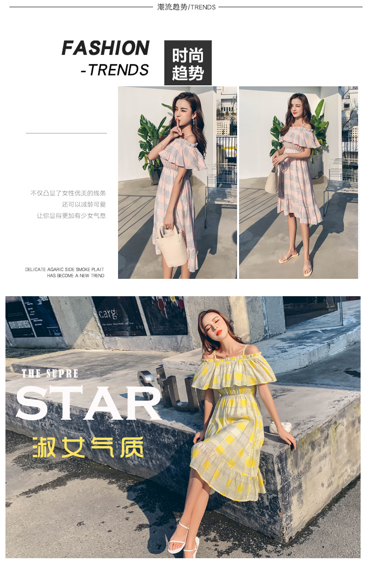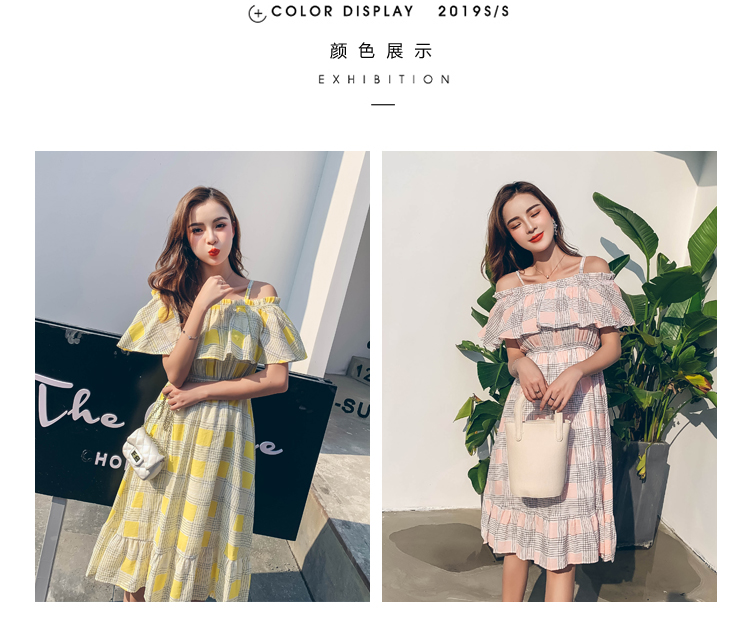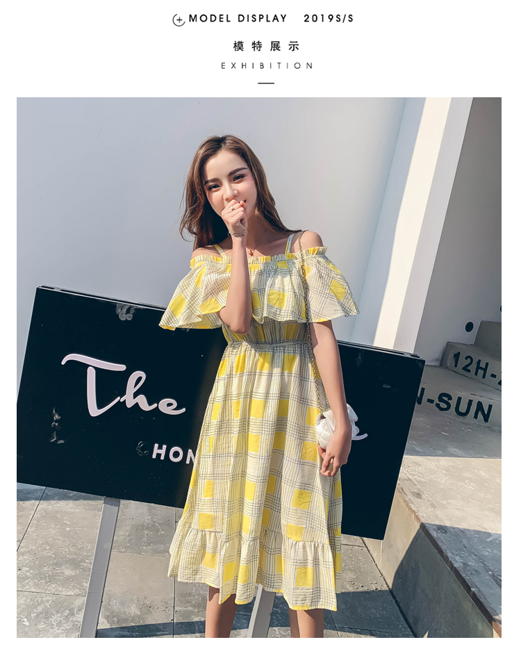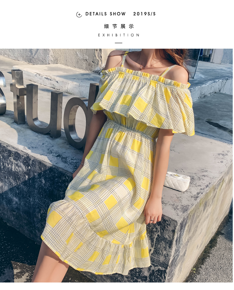 >> 2019夏新法國小眾時尚一字肩荷葉邊高腰吊帶連衣裙