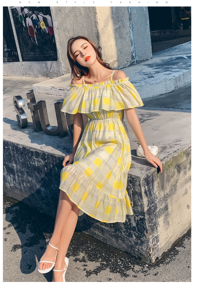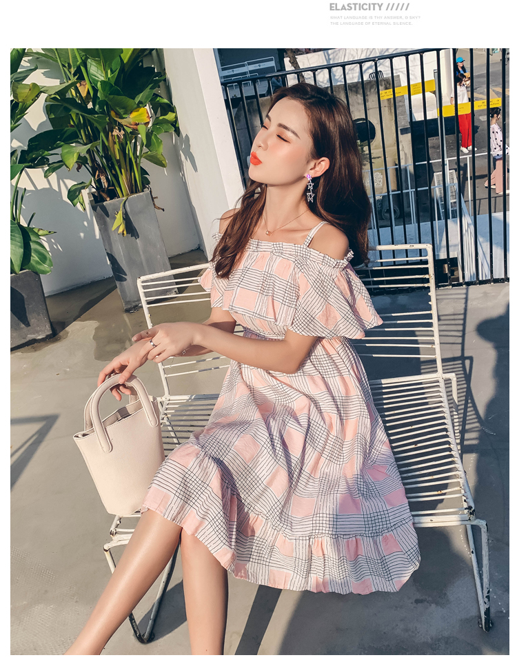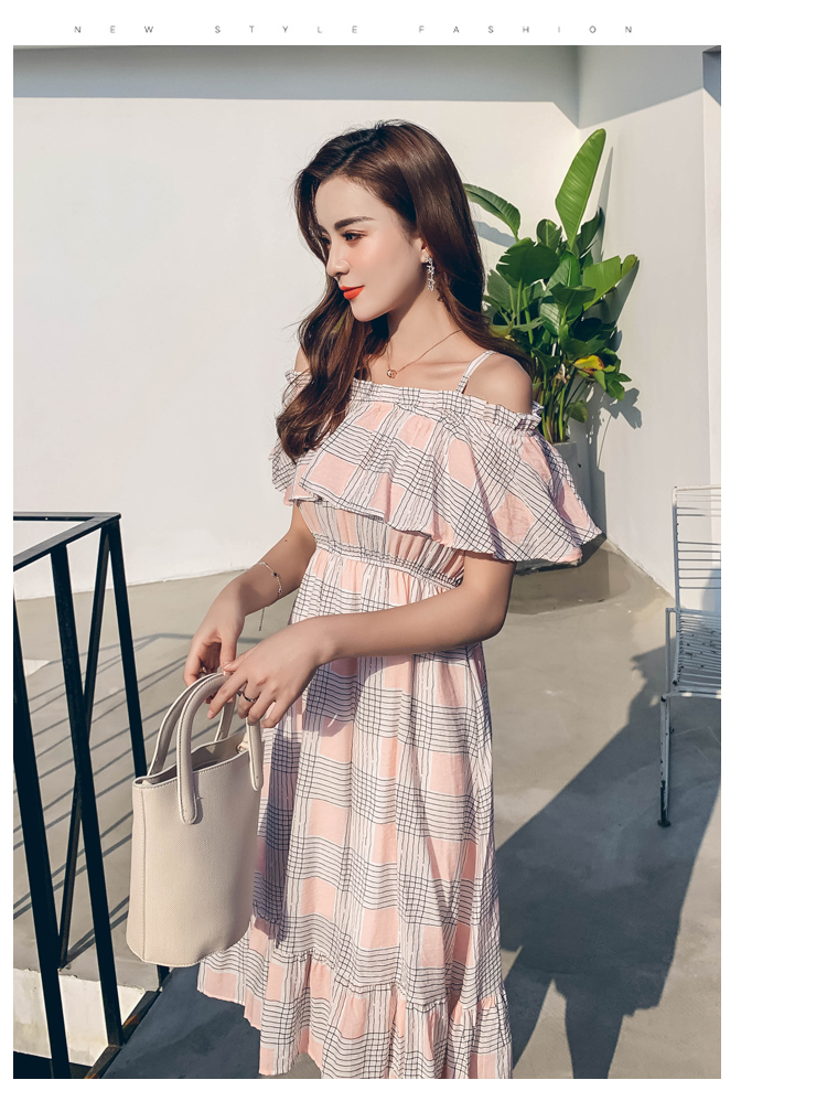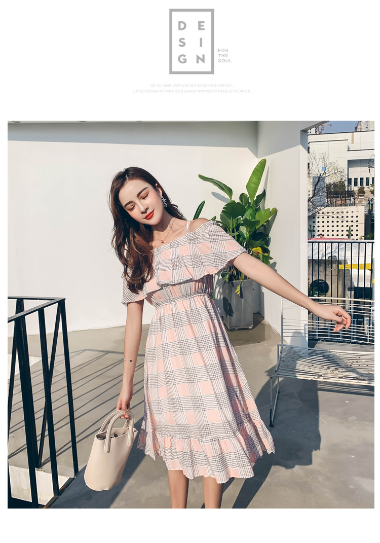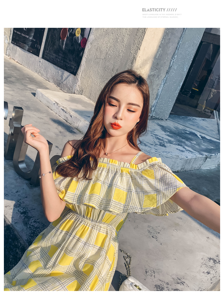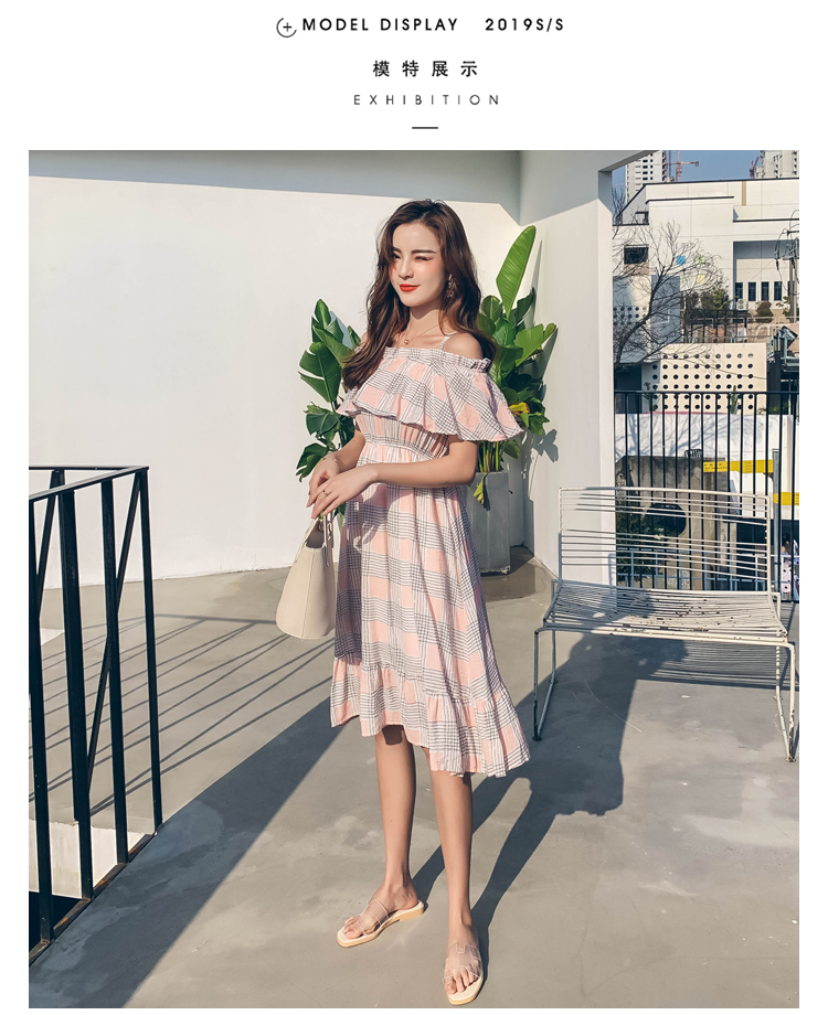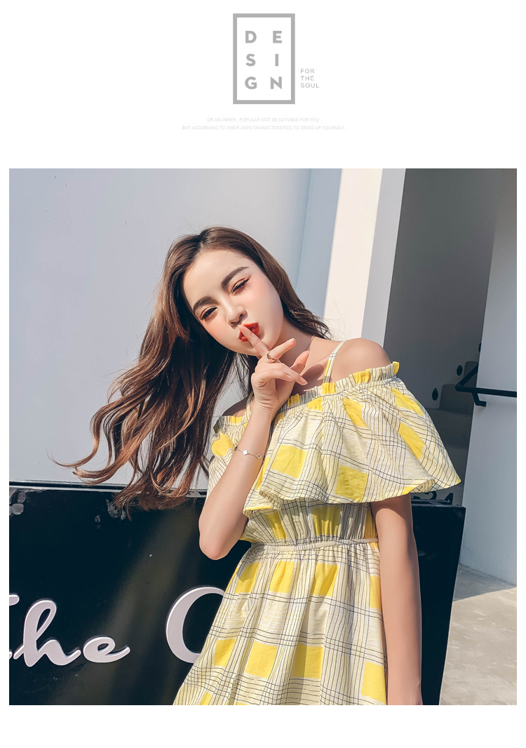 >> 2019夏新法國小眾時尚一字肩荷葉邊高腰吊帶連衣裙