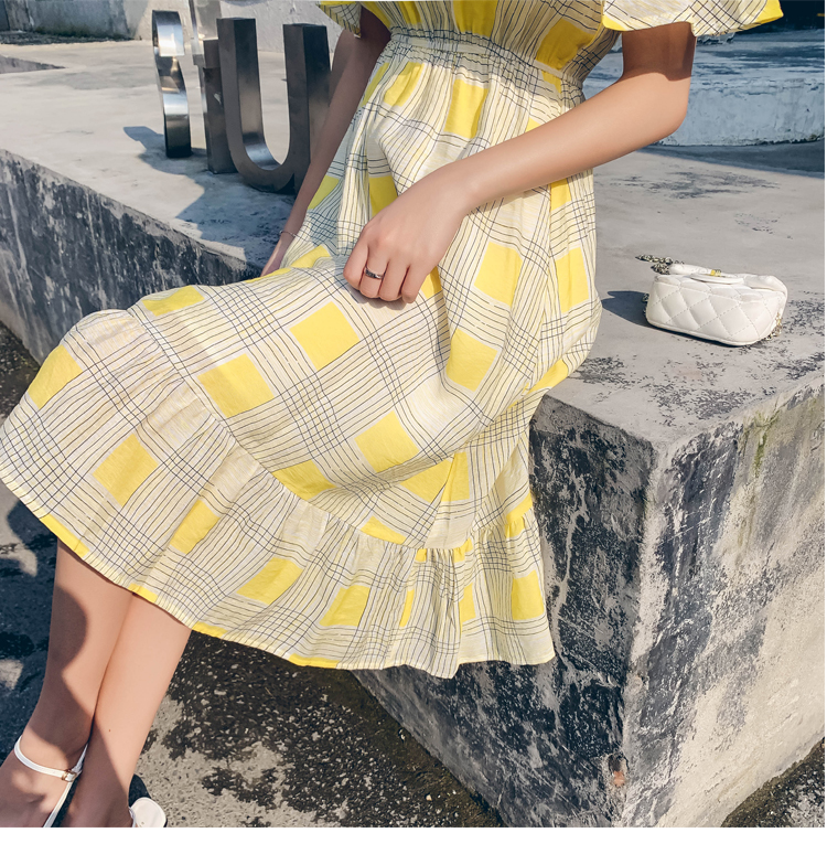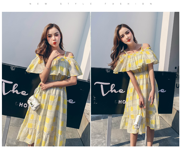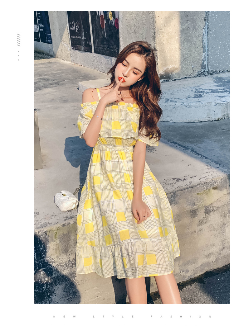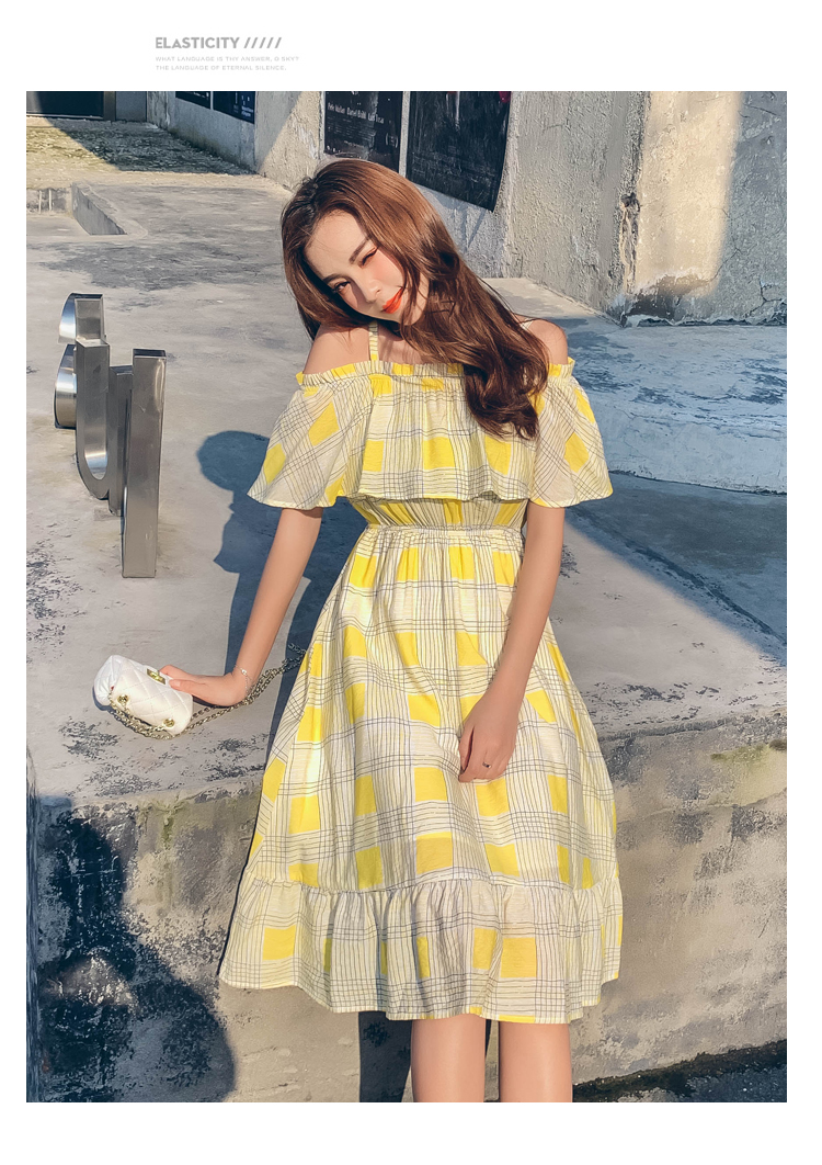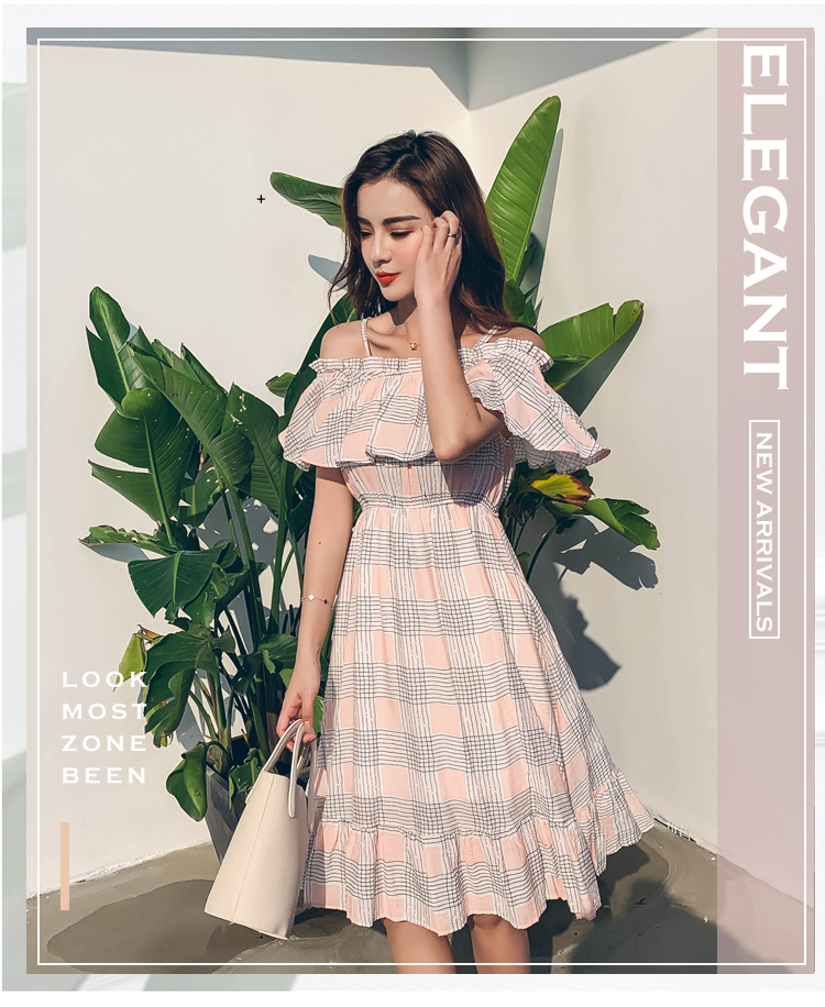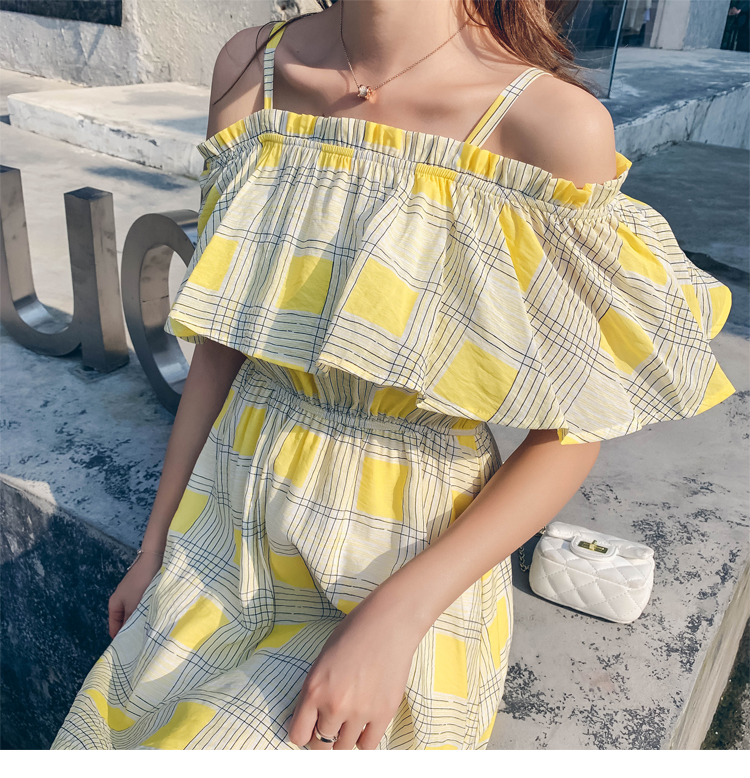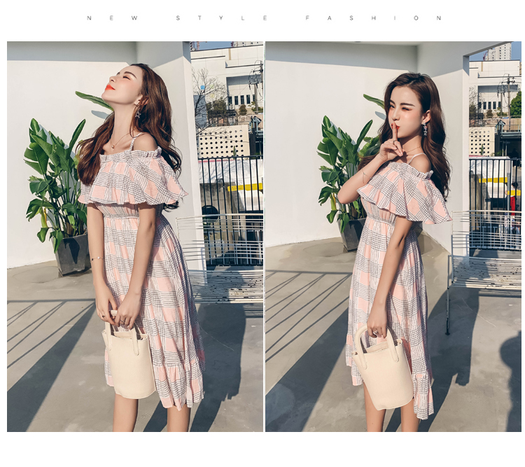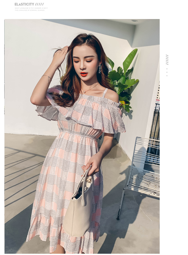 >> 2019夏新法國小眾時尚一字肩荷葉邊高腰吊帶連衣裙