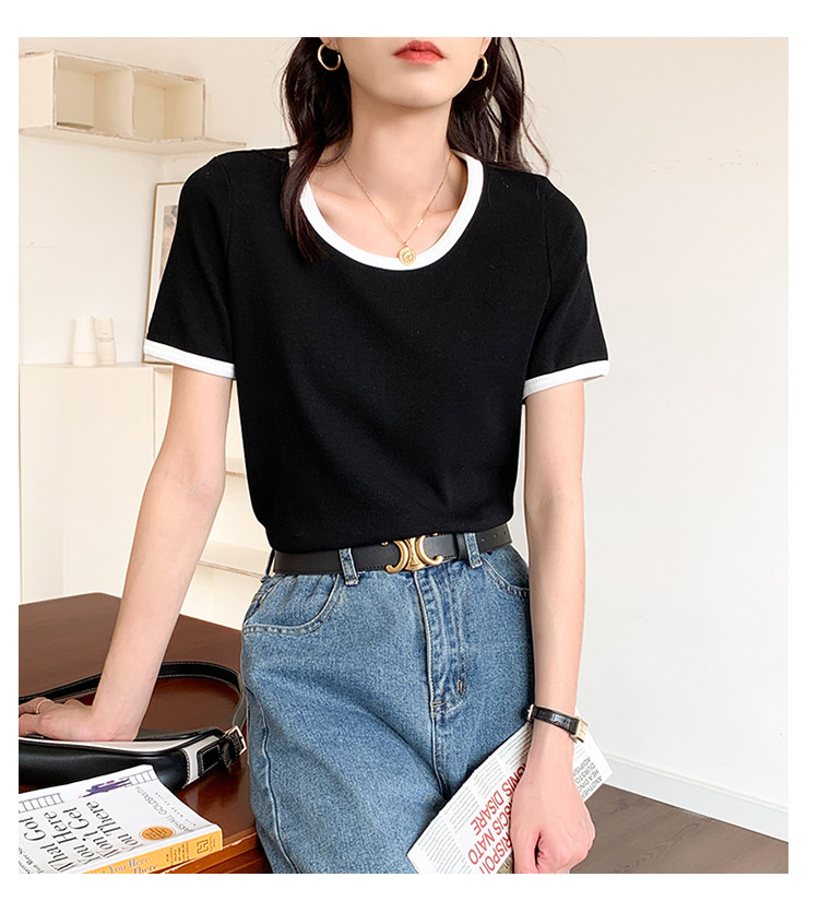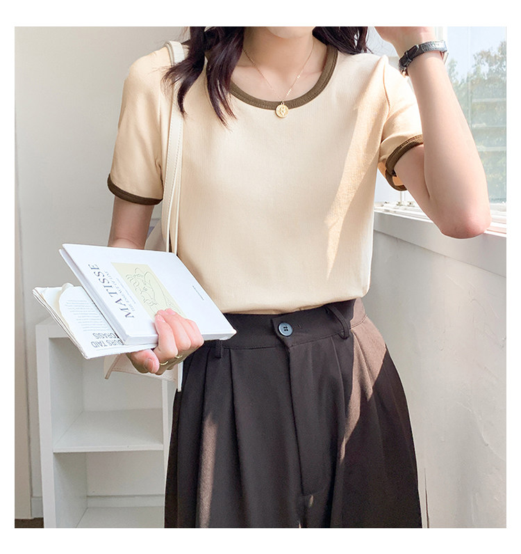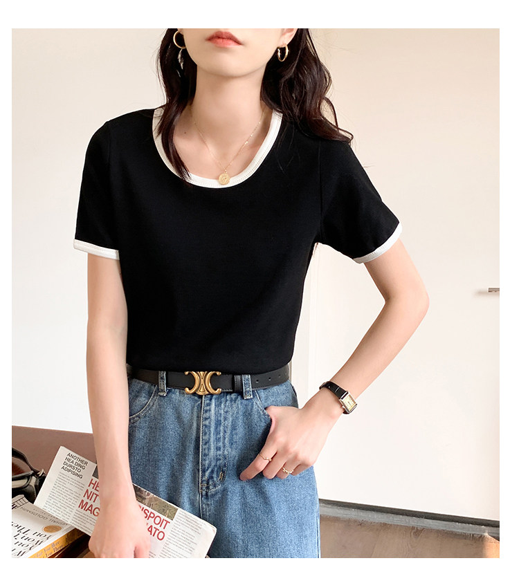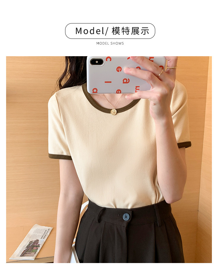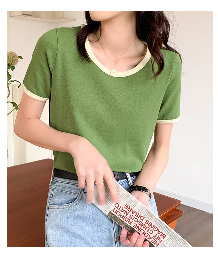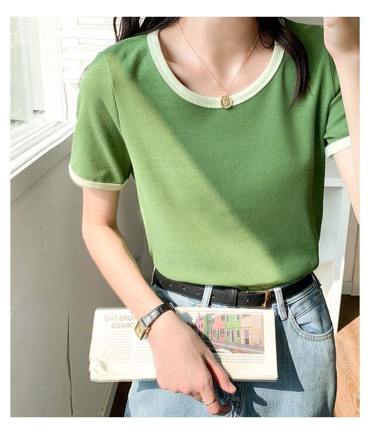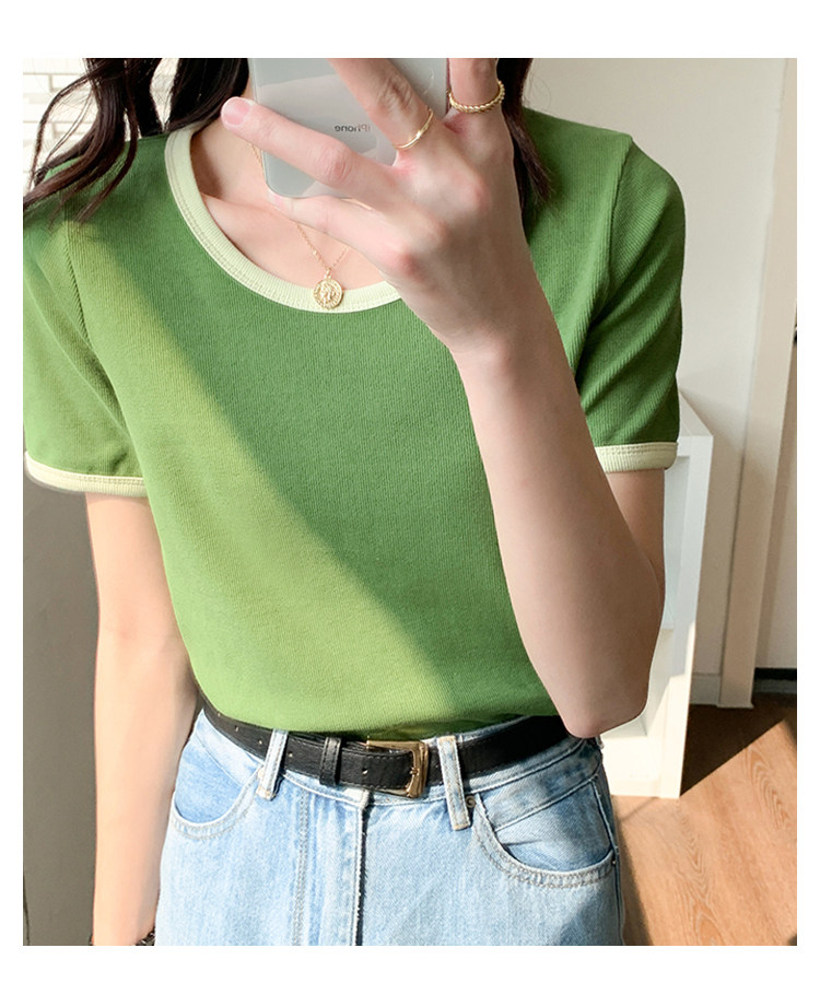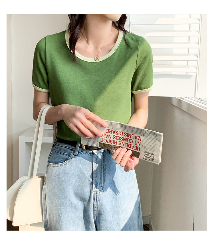 >> 實拍實價牛油果綠短袖t恤女2022夏季新款設計感撞色拼接短款上衣