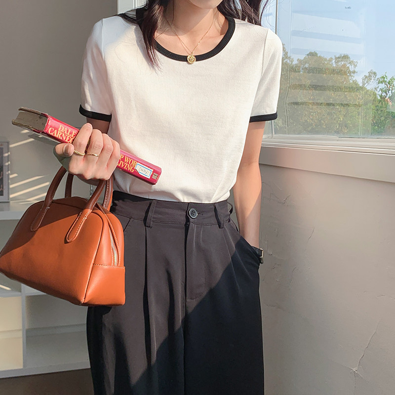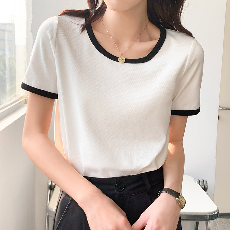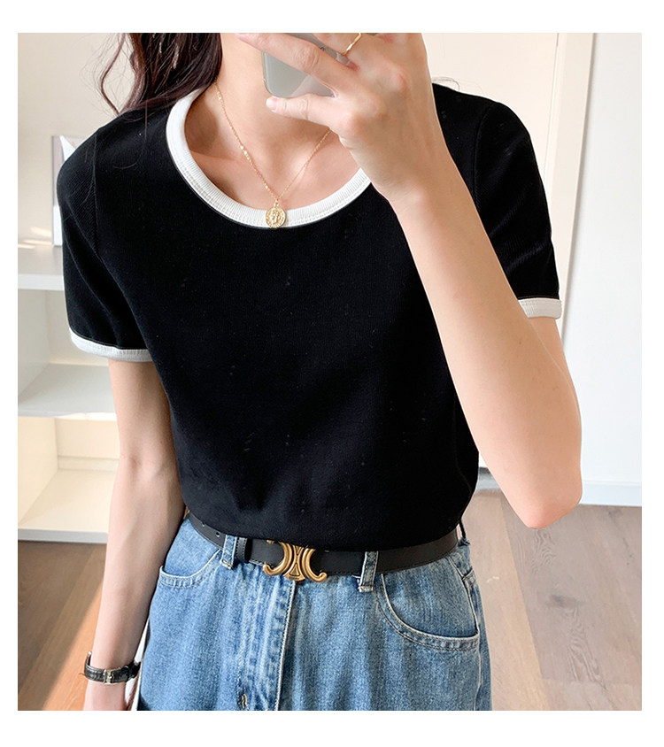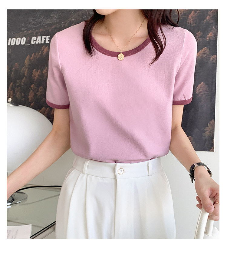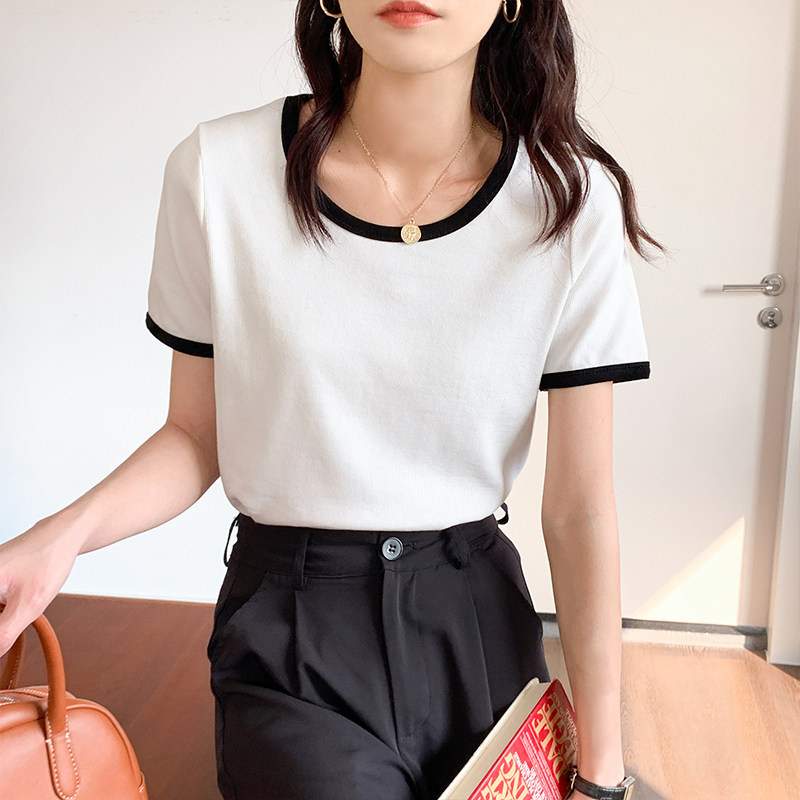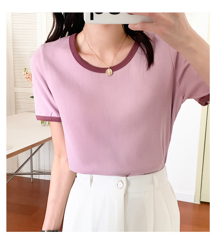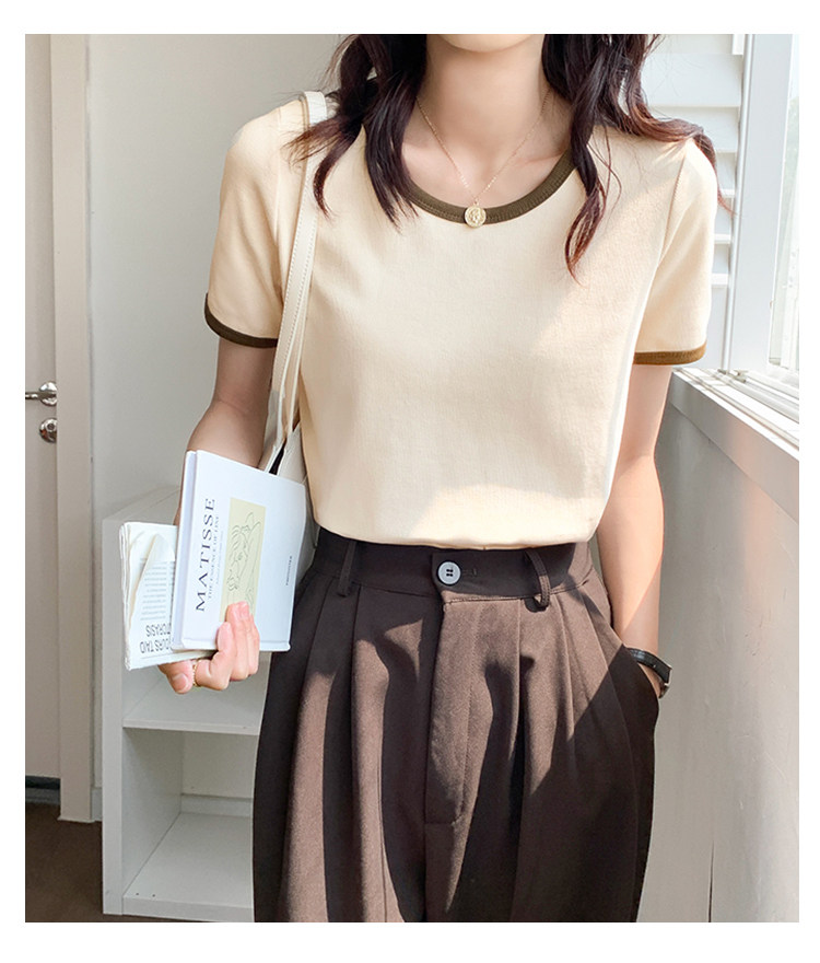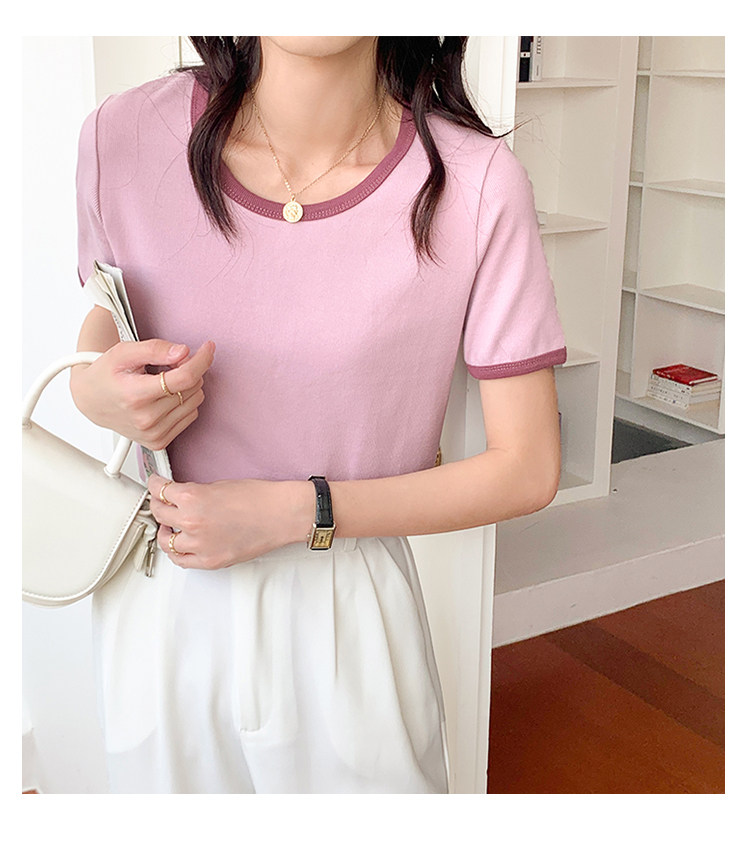 >> 實拍實價牛油果綠短袖t恤女2022夏季新款設計感撞色拼接短款上衣