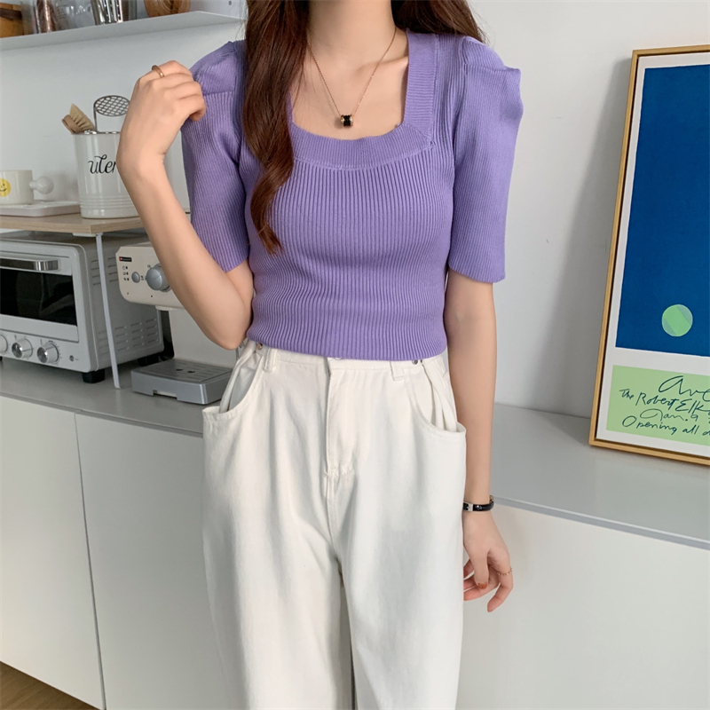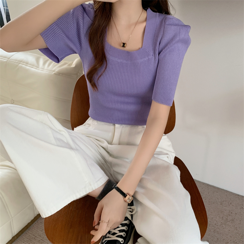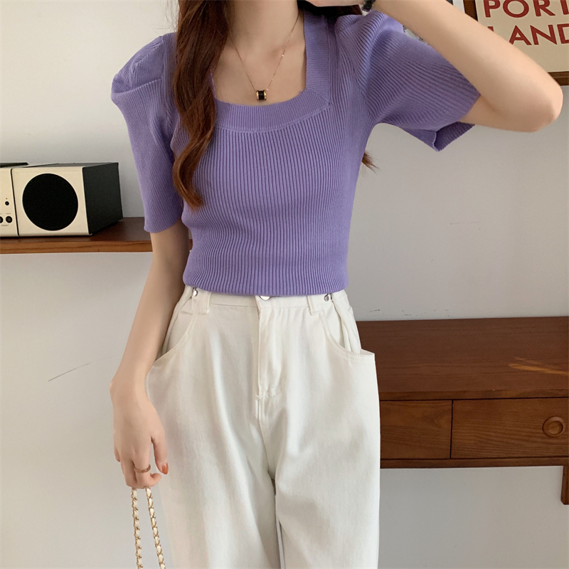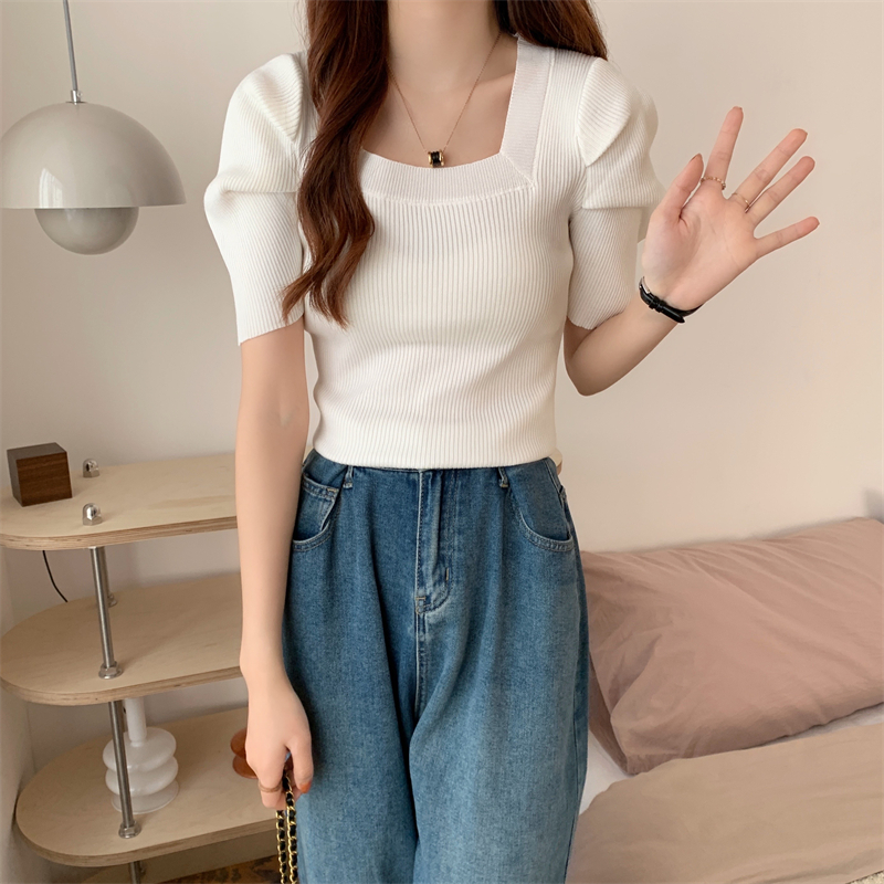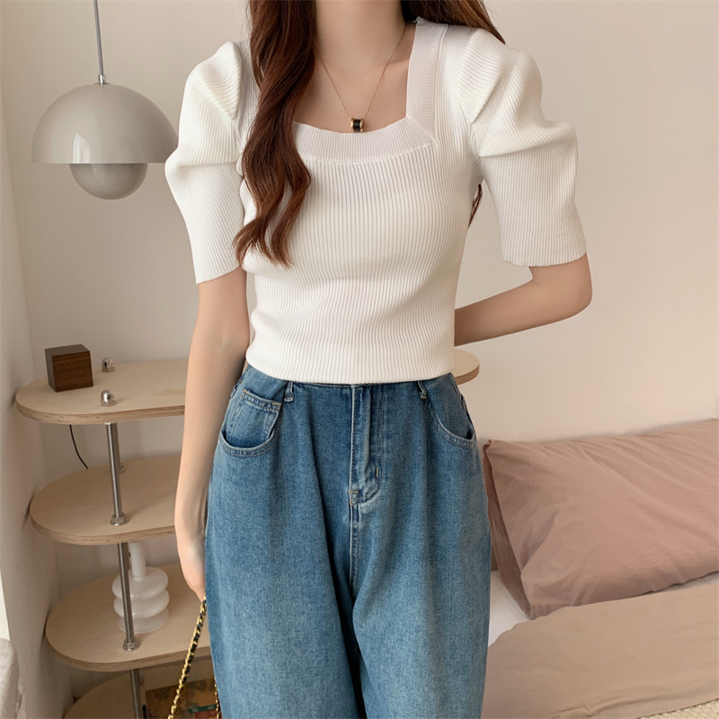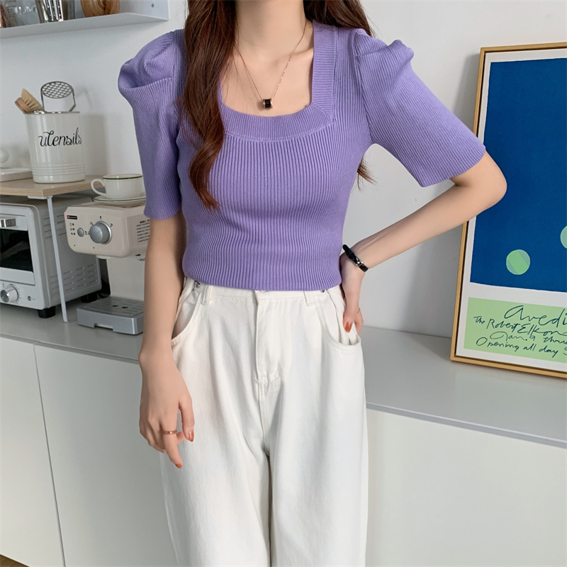 >> 新款設計感洋氣法式方領針織上衣泡泡袖小眾修身短袖T恤