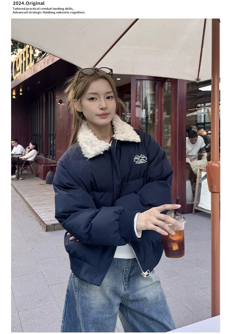 >> 网图潮牌字母刺绣美式仿羊羔毛领设计感加厚小个子短款棉服棉衣女