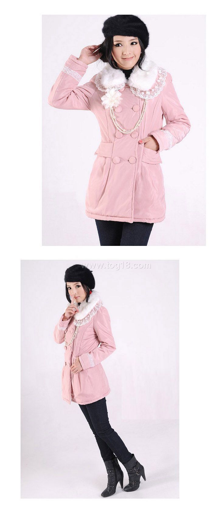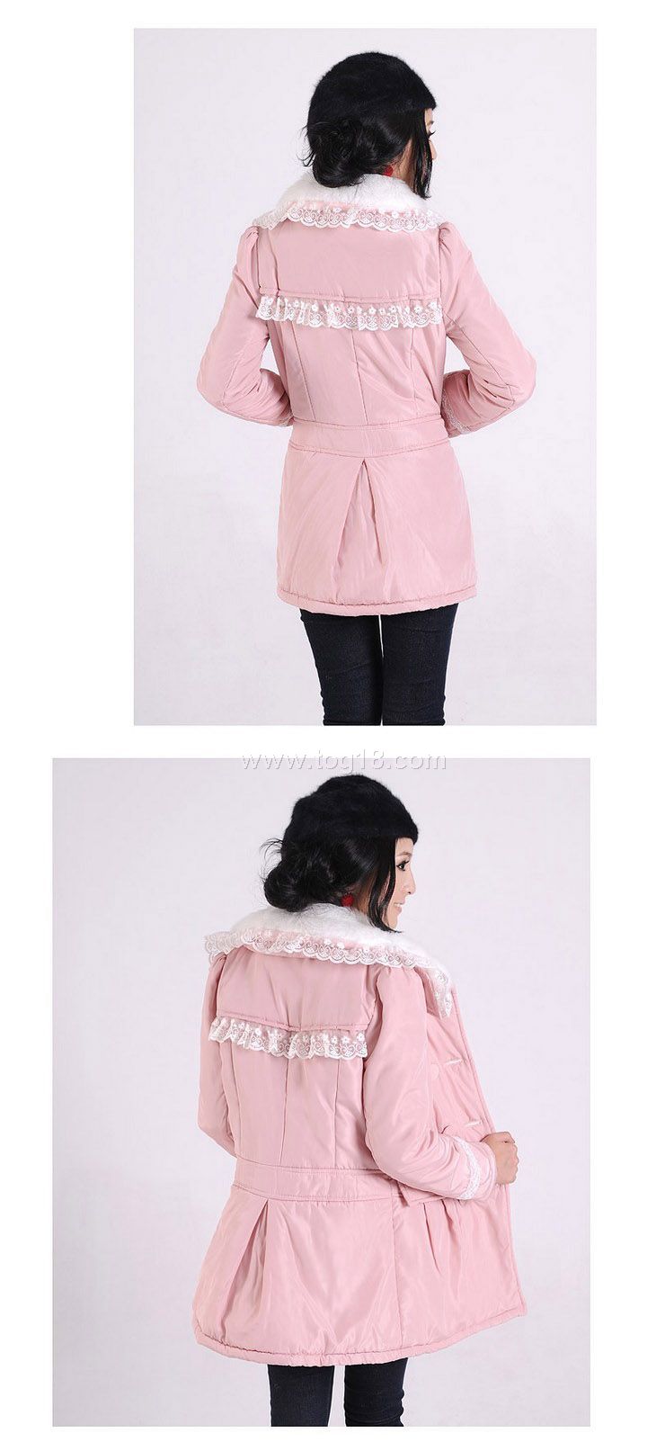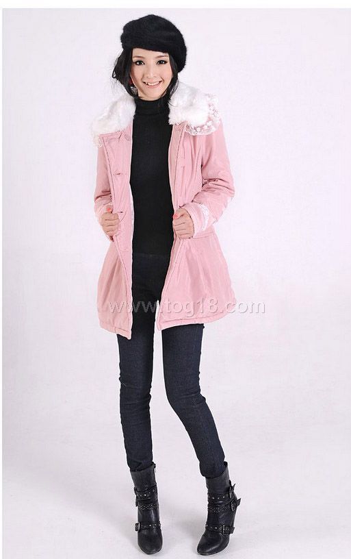 1.此款棉衣有裡襯,填充物為雲絲棉保暖性好;真口袋。白色仿兔毛領可拆.
