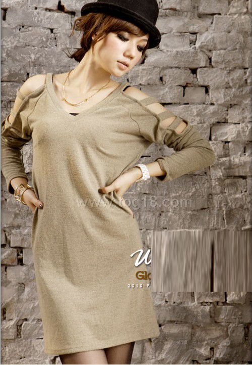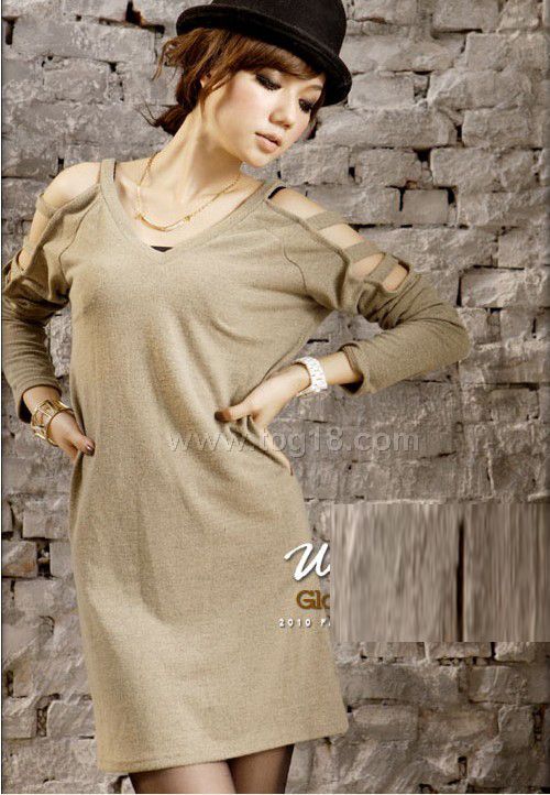 鏤空洋裝長袖包臀T(杏色)