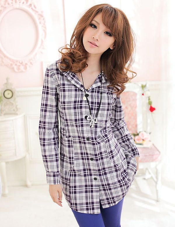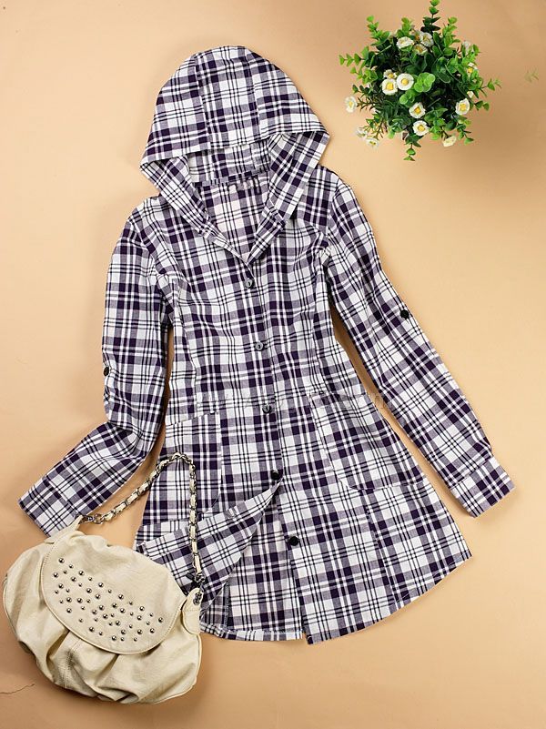 女裝流行格子連帽兩用袖襯衫 (藍色)
