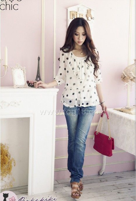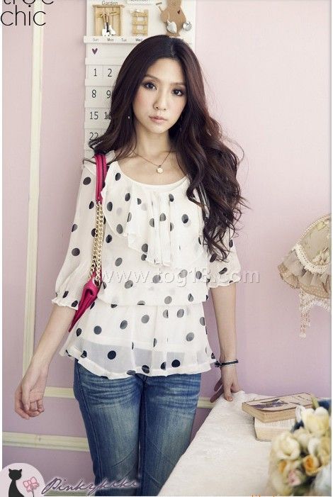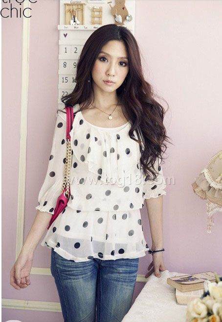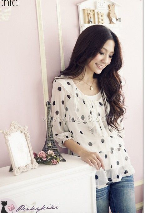點點中袖雪紡衫(白色)