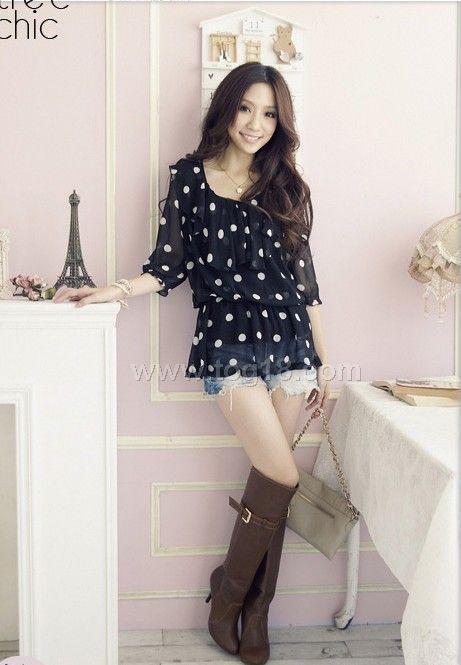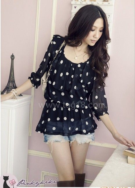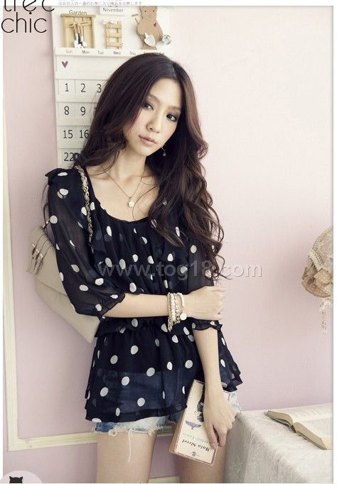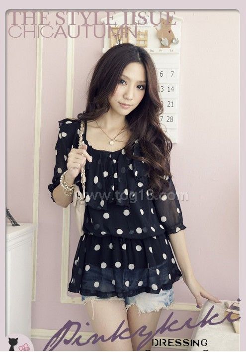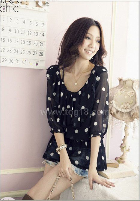 點點中袖雪紡衫(黑色)
