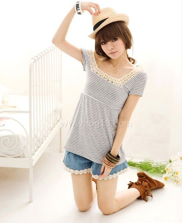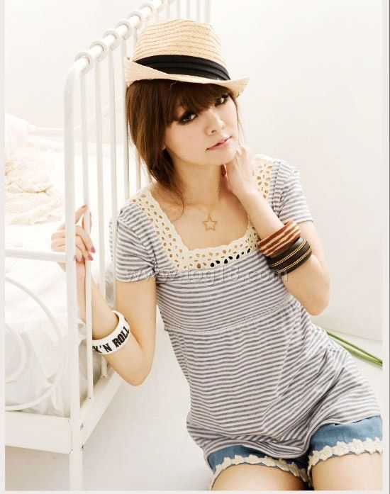鏤空洞洞方領背伸縮條紋上衣(灰色)