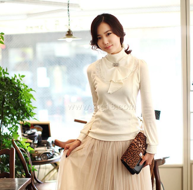 款式說明:非常淑女氣質的針織打底衫,優雅的蕾絲與蝴蝶結的完美組合,蝴蝶結可隨意拆取,配與鑲鑽的領花,三色選擇,春季裡超百搭的好款哦~