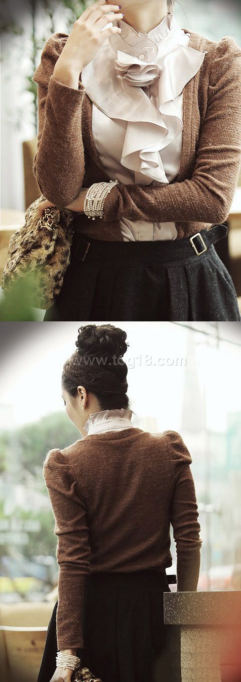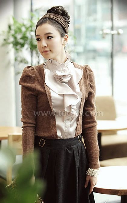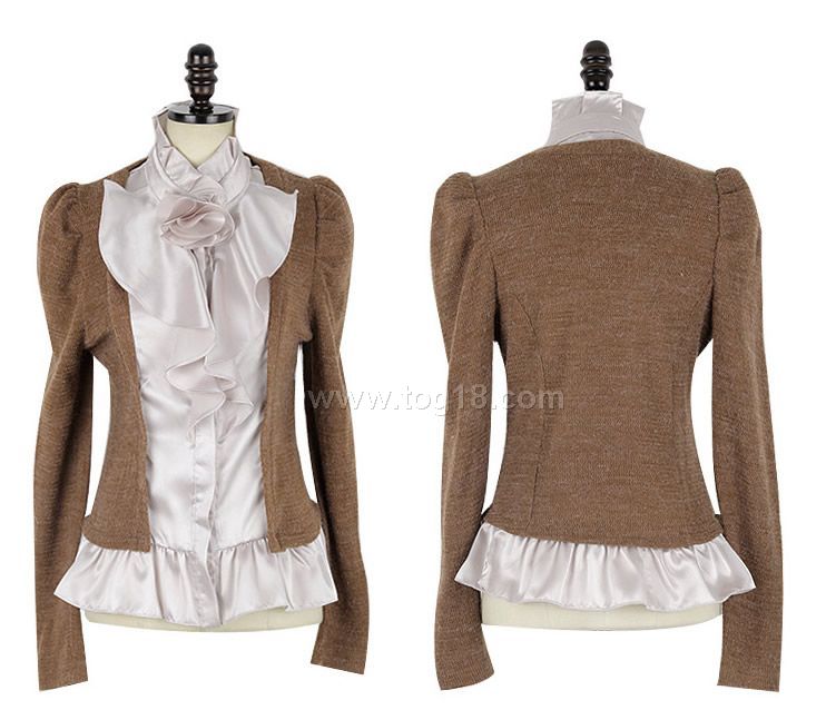 款式說明:一款組合面料設計的淑女風襯衫.羊毛混紡針織料配與仿真絲的絕妙搭配,領口精美的花朵,兩色選擇,均無色差,版型修身,OL氣質女人必備款~~