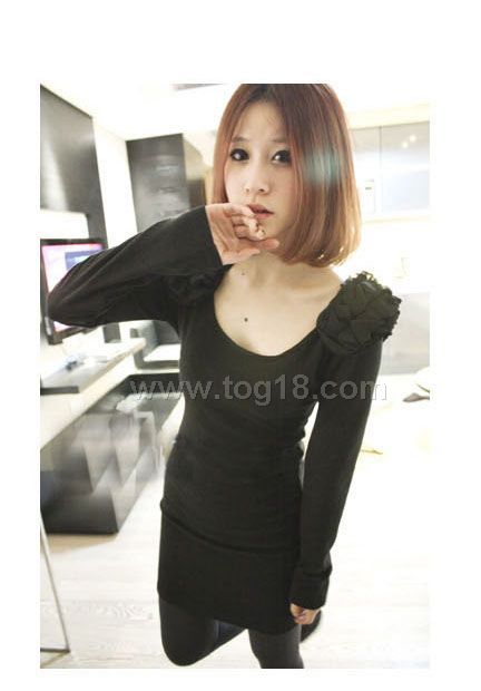 時尚長袖方領花肩T恤