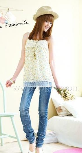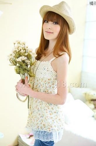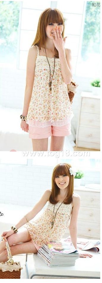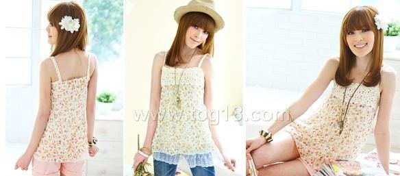 經典小碎花胸前編織棉花邊蕾絲下擺雪紡吊帶衫 2色