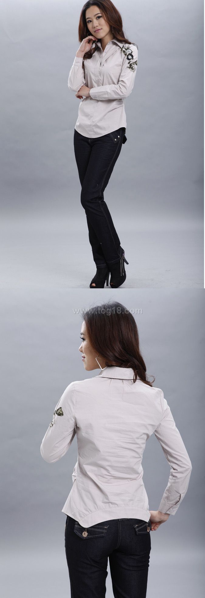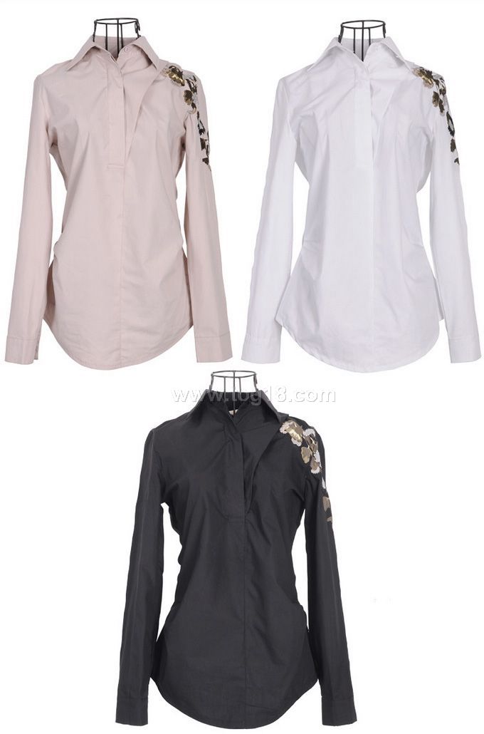 捏皺設計 弧形下擺 長袖繡花襯衫