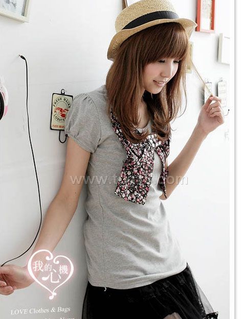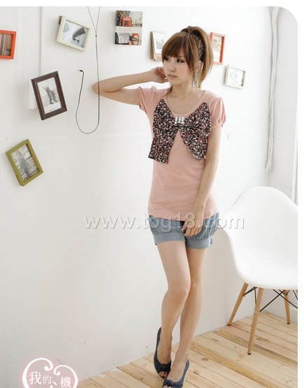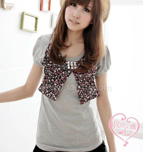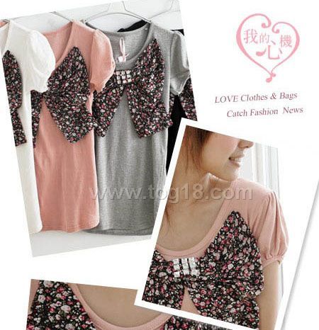 甜美鑲鑽花色蝴蝶結圓領公主短袖T恤 2色