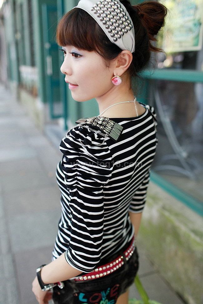 復古泡泡袖公主金屬肩章百搭經典黑白條紋中袖T恤