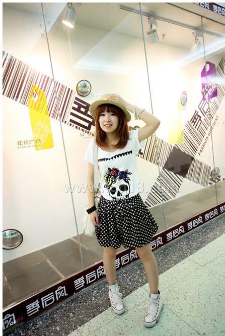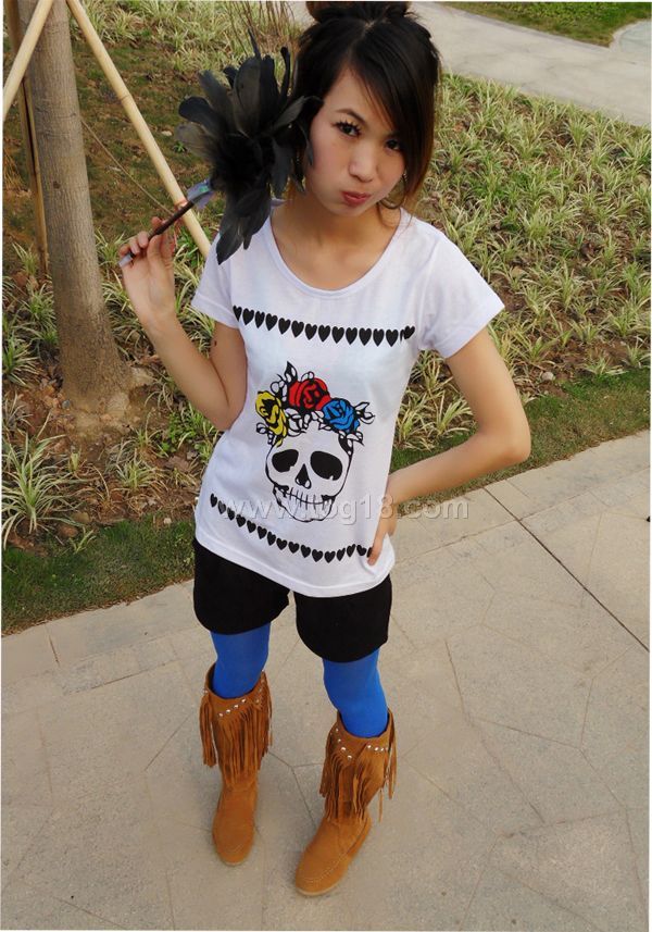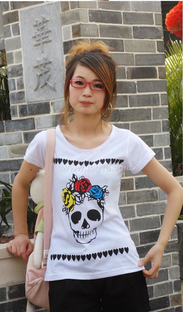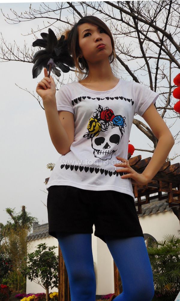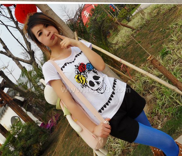 韓版瑞麗百搭個性花朵骷髏頭印花T恤