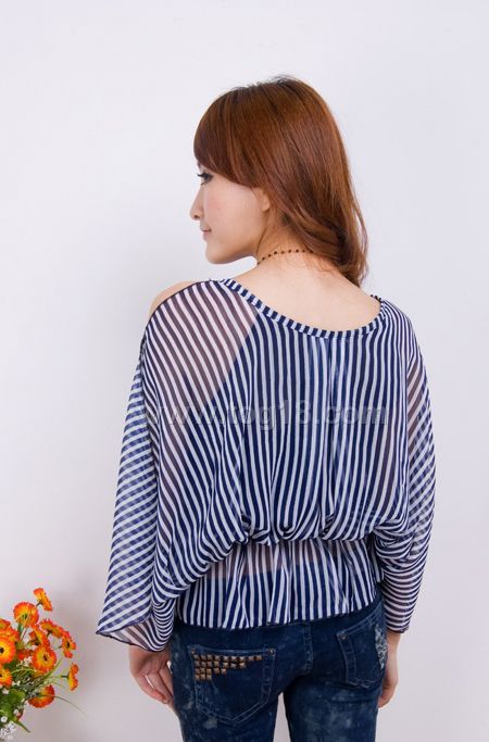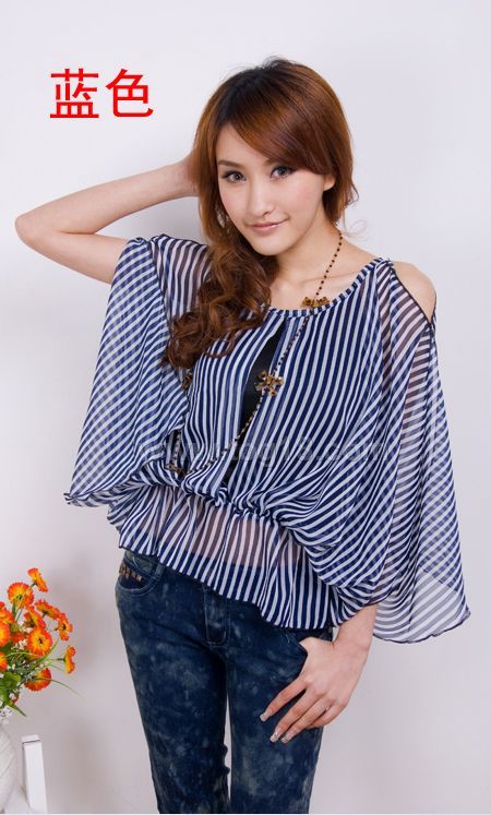 韓版瑞麗歐美范兒條紋飛飛袖雪紡衫