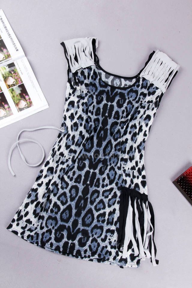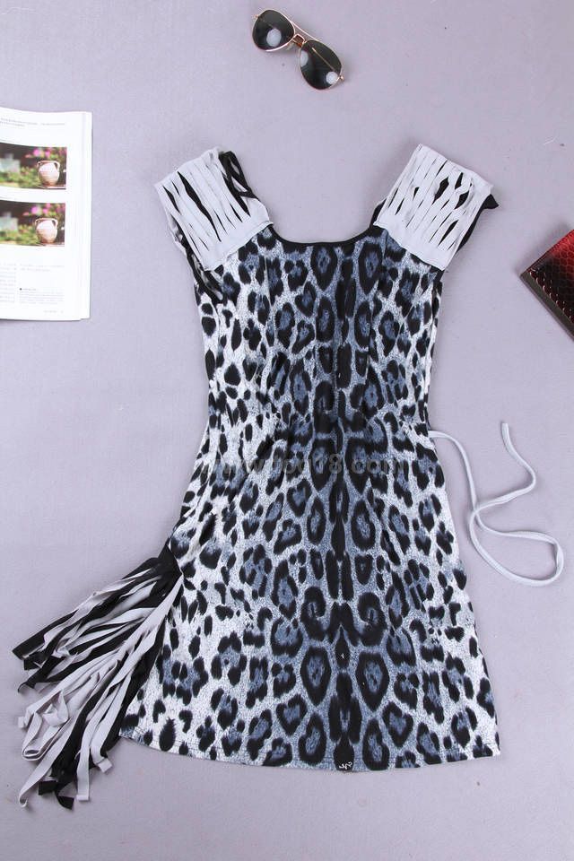 獨特肩膀下擺不規則流蘇豹紋連衣裙(實拍)