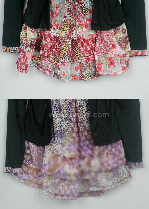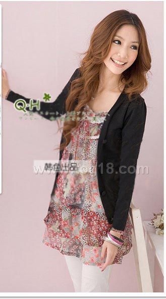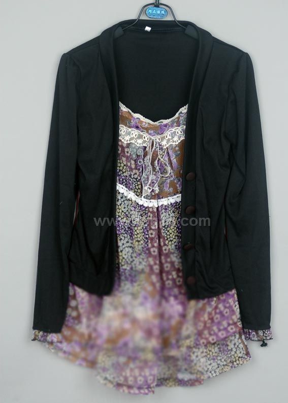 假兩件式,裡面選擇雪紡面料加蕾絲花邊感很有飄逸,有韓國風味,外面是加上羅紋式兩種面料混搭省去了一件一件套在一起的麻煩事兒,可以少穿一件,感覺不變。